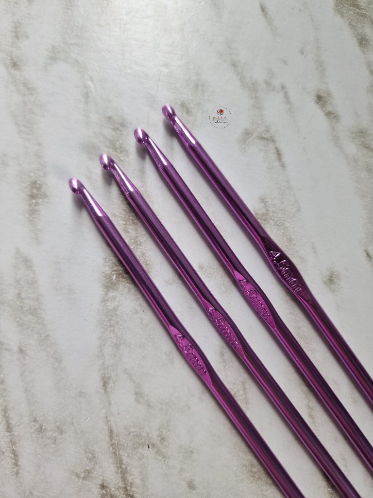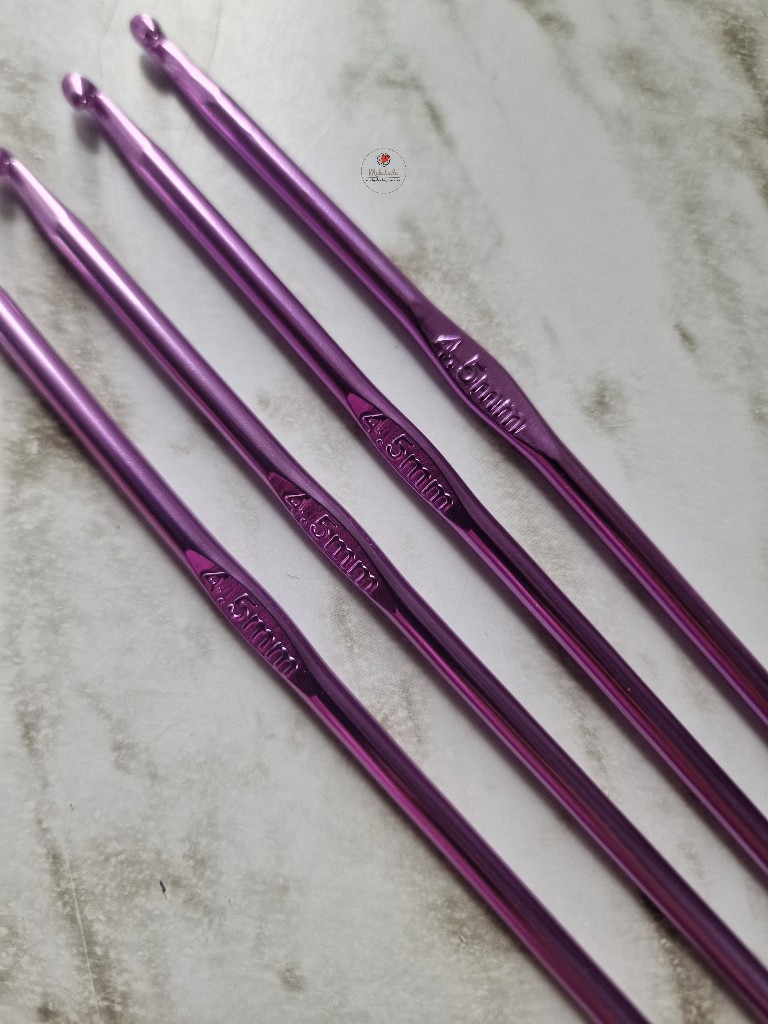 Violetinės spalvos ir patogus laikyti – šis 4.5 mm metalinis vąšelis taps puikiu palydovu tavo nėrimo projektuose.