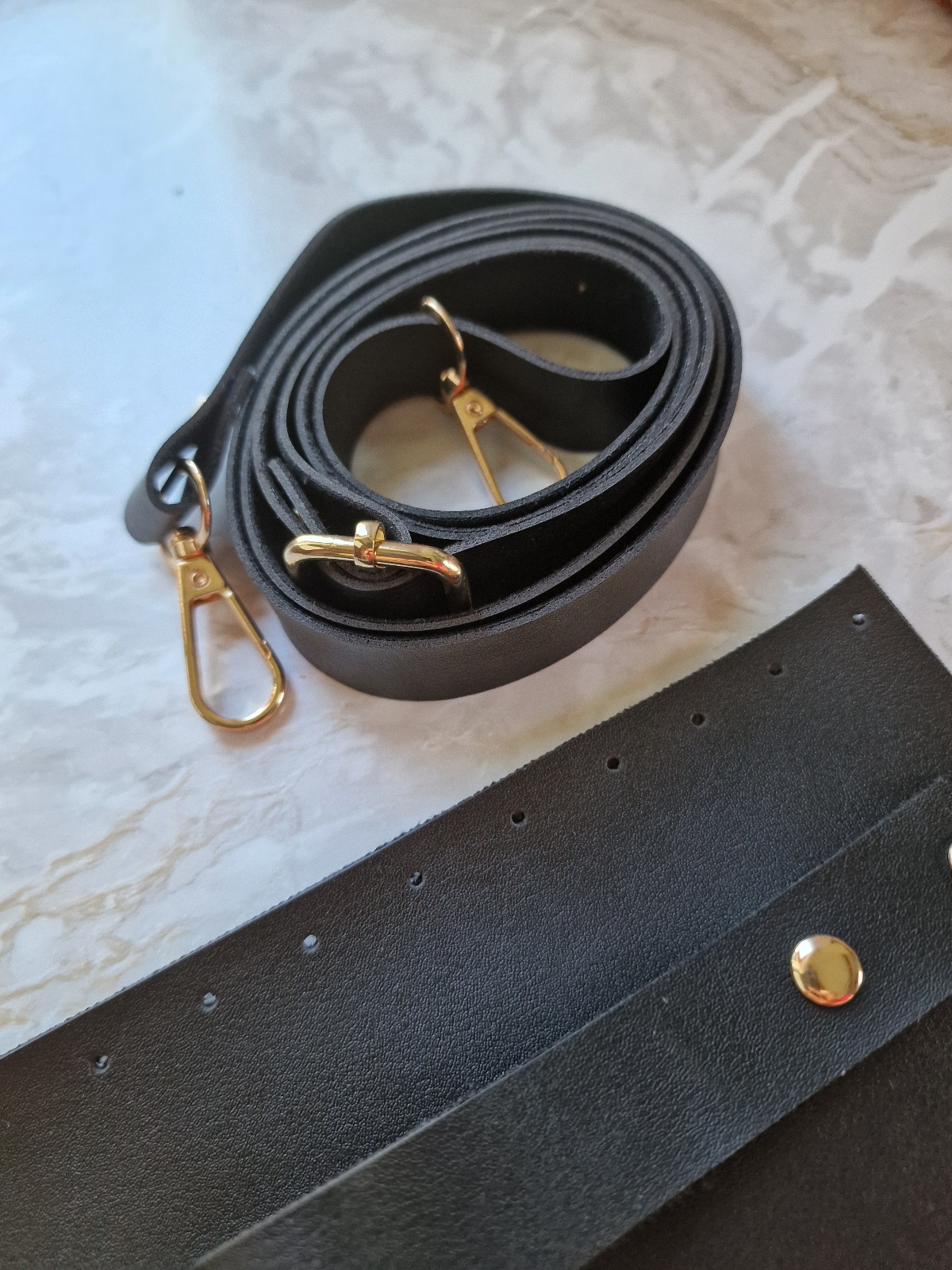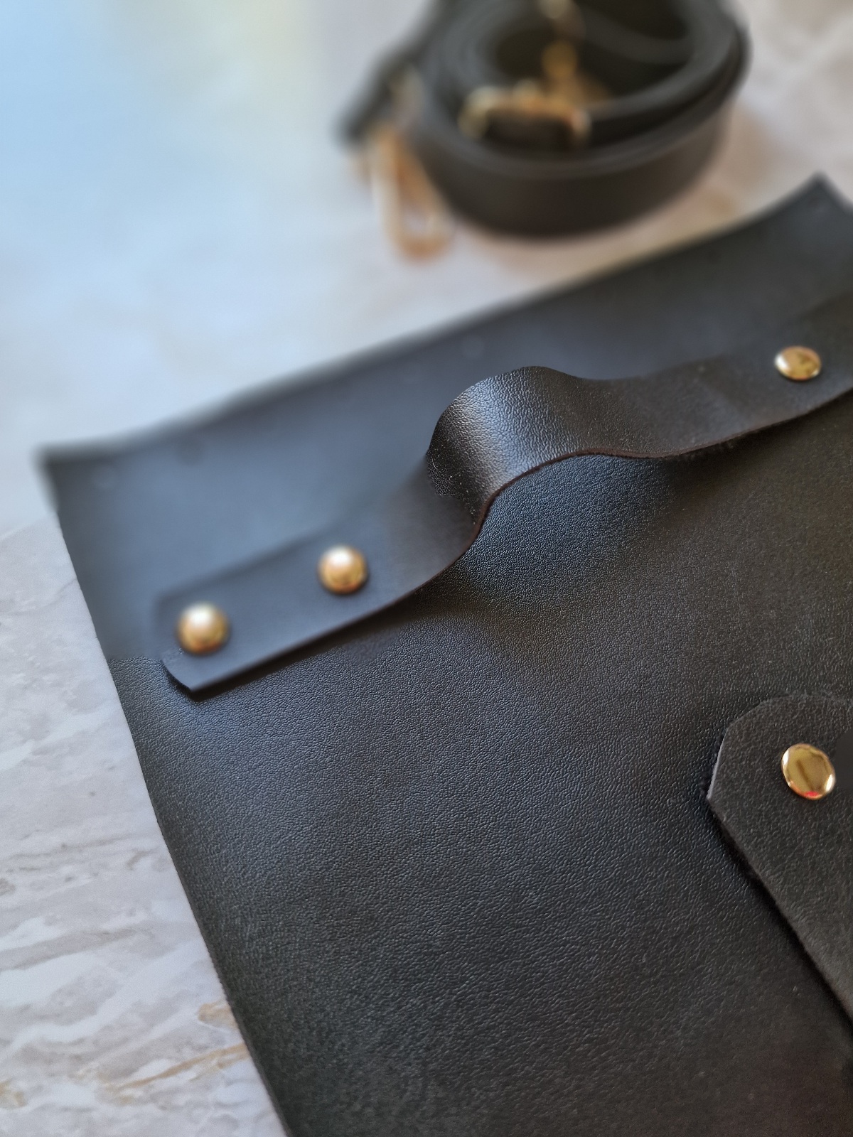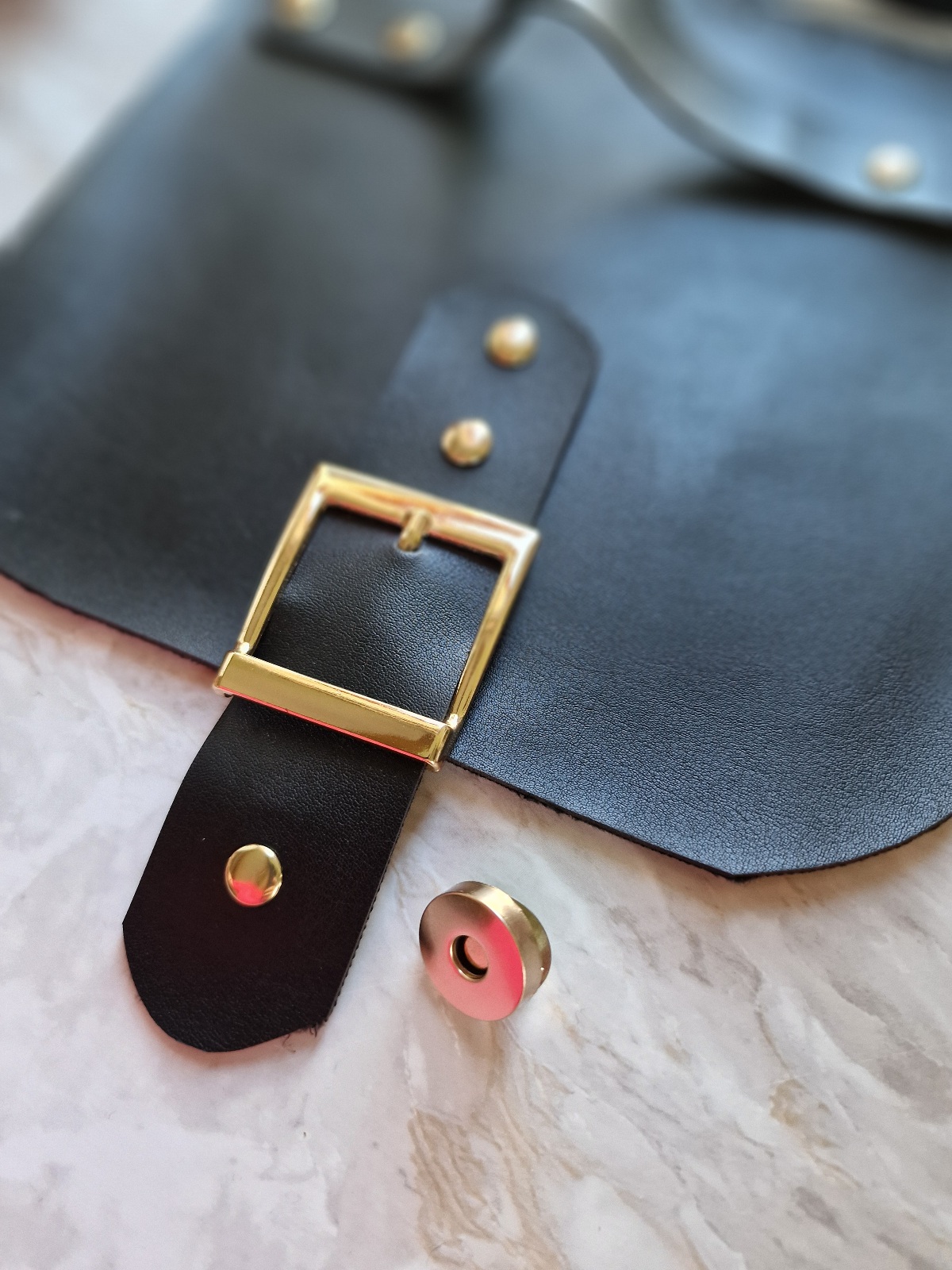 Klasikinio dizaino juodos eko odos komplektas su auksinės spalvos detalėmis – tvirtas ir patogus pasirinkimas didesnei rankinei. Dangtelis užsisega magnetiniu užsegimu, todėl patogu naudoti kasdien.