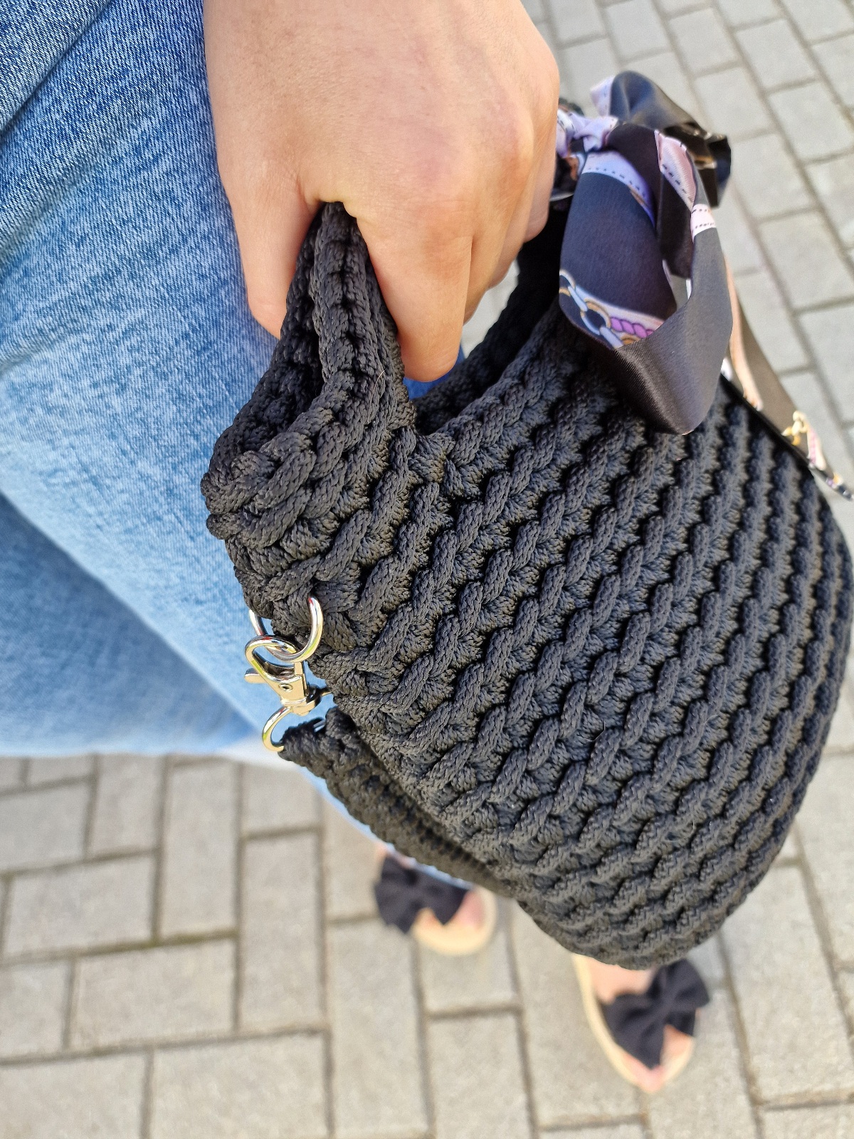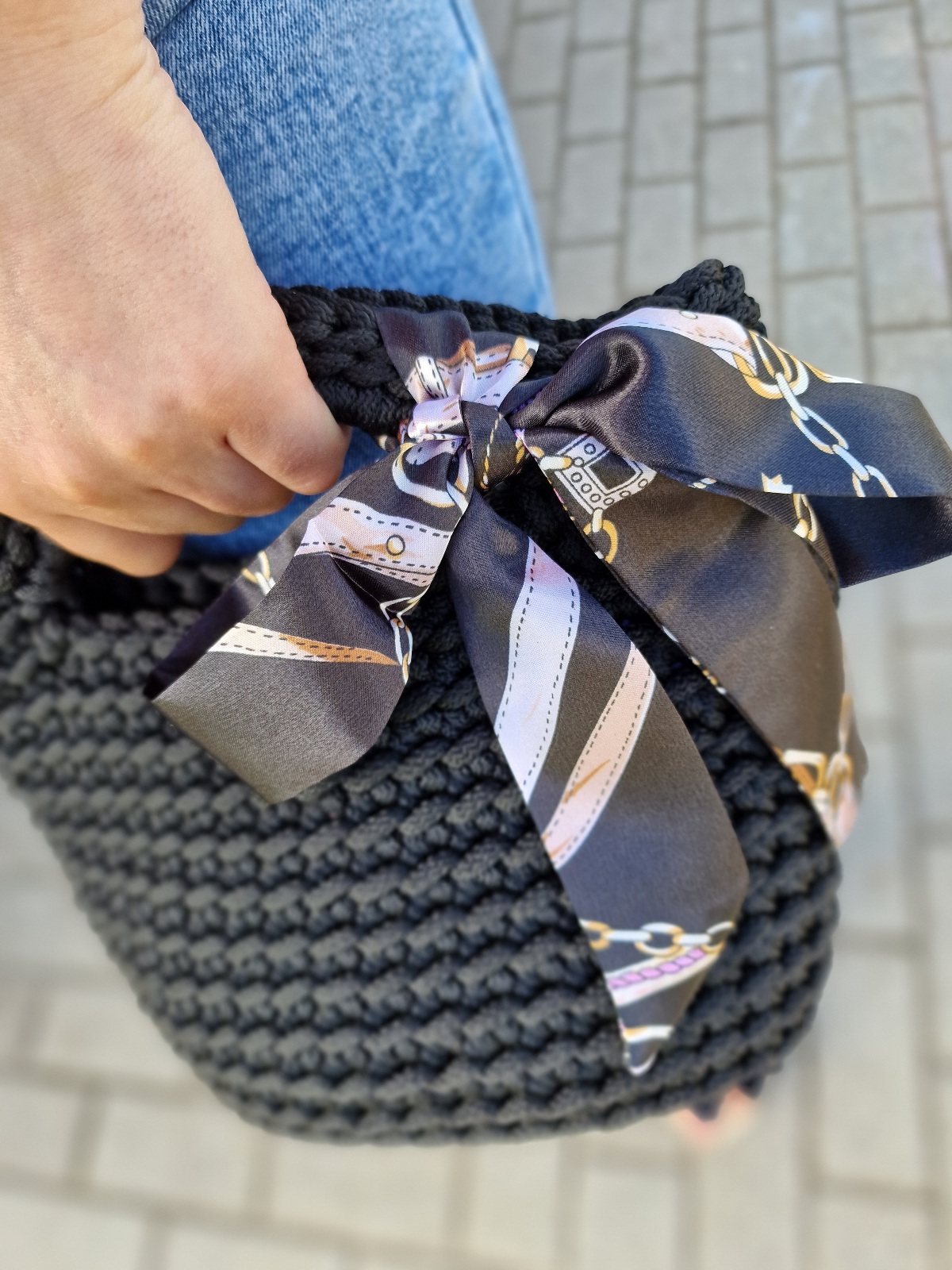Ši, elegantiška, rankomis nerta rankinė iš kokybiškos 5-6 mm poliesterio virvės – tai ne tik patogus, bet ir išskirtinis stiliaus akcentas. Juodas atspalvis puikiai dera su įvairiais deriniais, o subtili skarelė ant rankenos suteikia žaismingumo ir moteriškumo. Rankinė turi patogią ilgesnę rankeną, todėl gali būti nešiojama tiek rankoje, tiek ant peties.