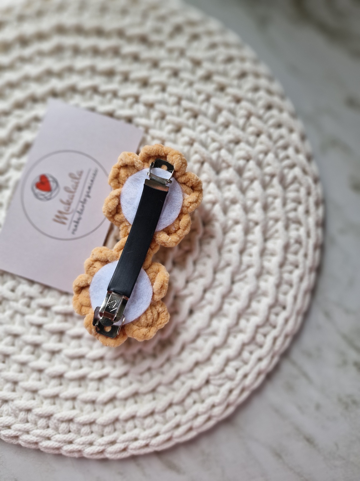Žaisminga plaukų segė su dviem nertomis gėlytėmis – puikus aksesuaras norinčioms įnešti švelnumo į savo aprangą ar šukuoseną.