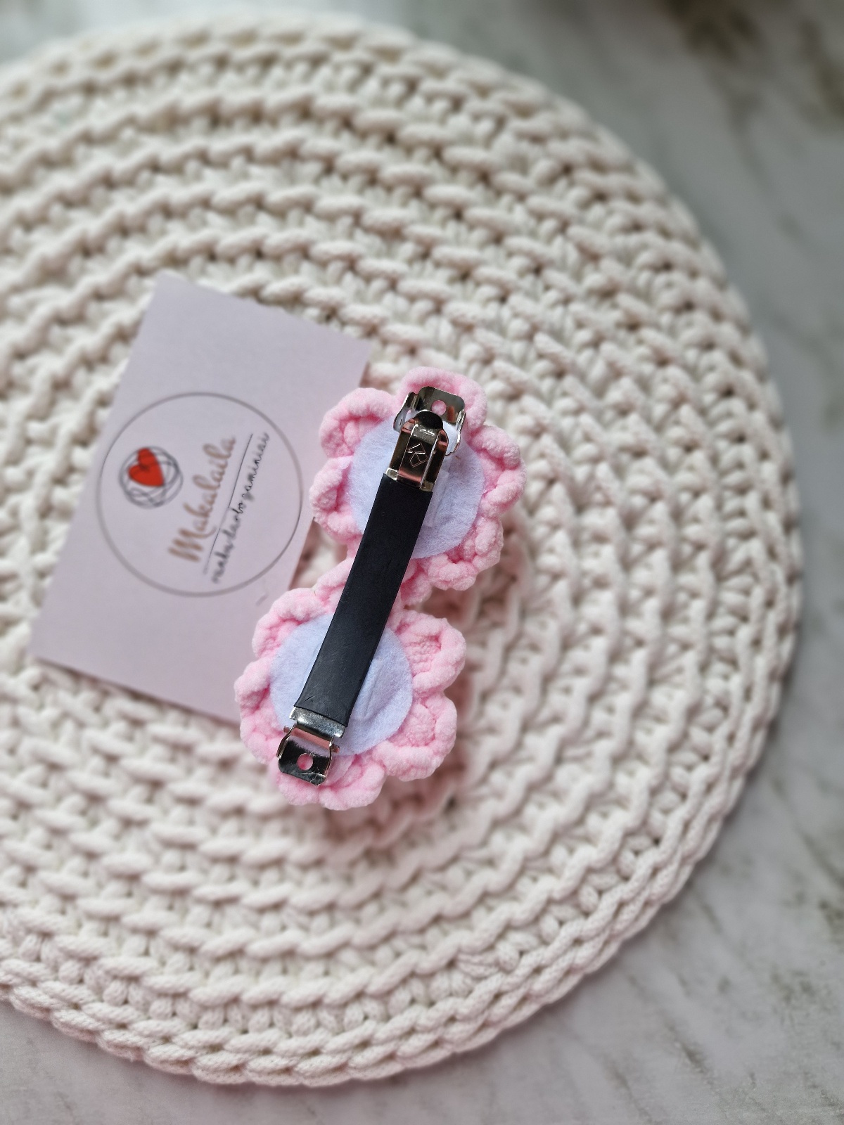Žaisminga plaukų segė su dviem nertomis gėlytėmis – puikus aksesuaras norinčioms įnešti švelnumo į savo aprangą ar šukuoseną.
