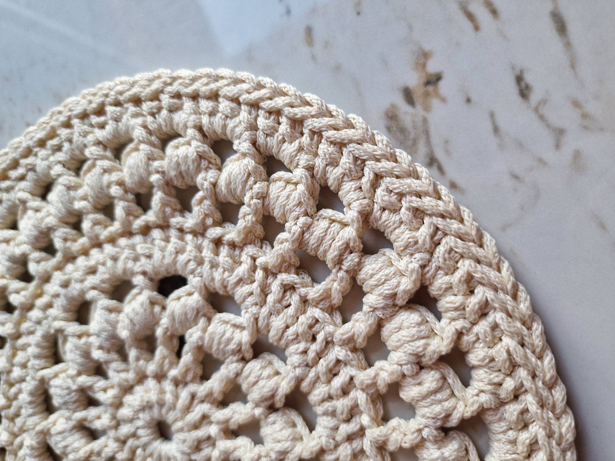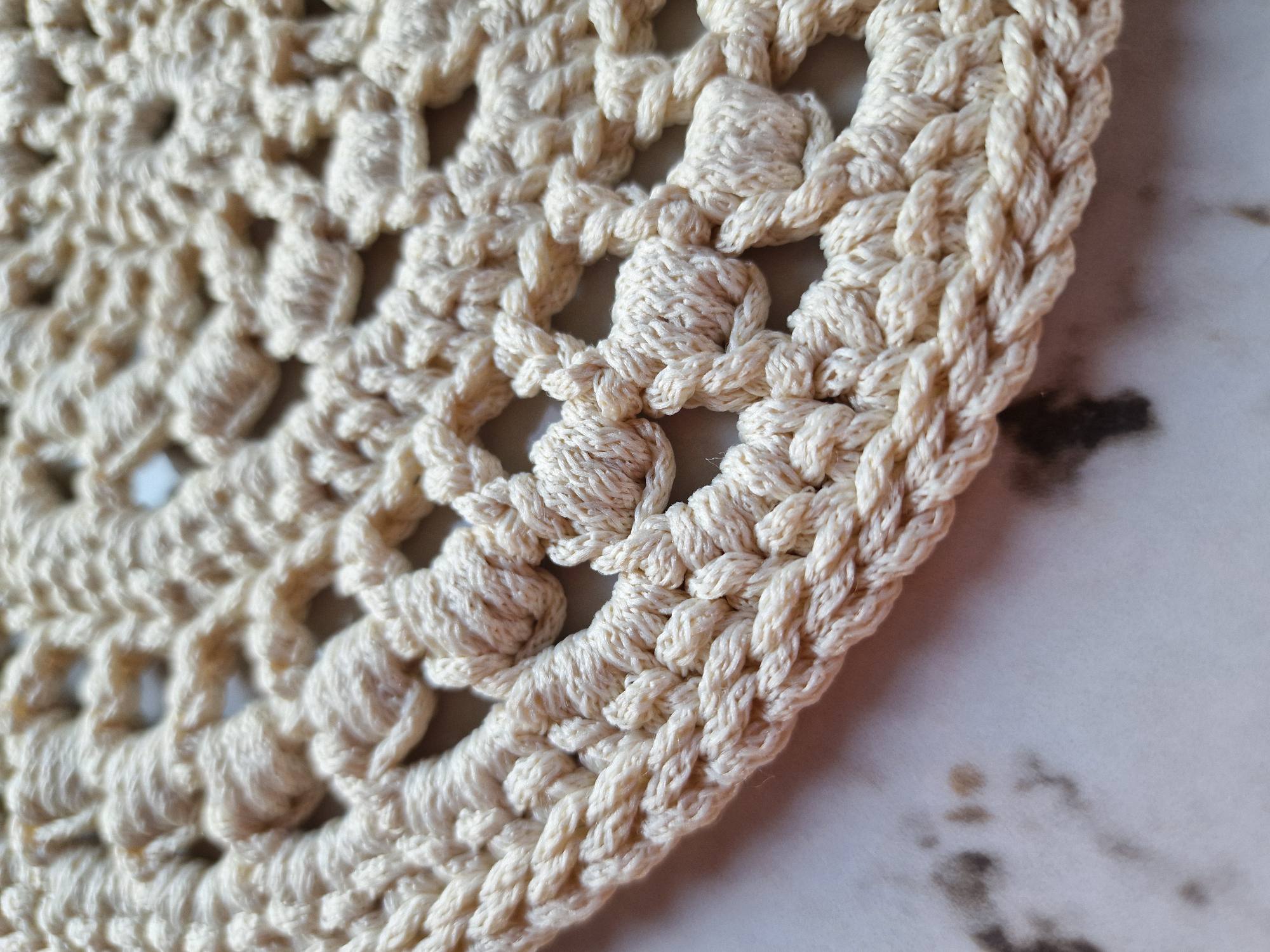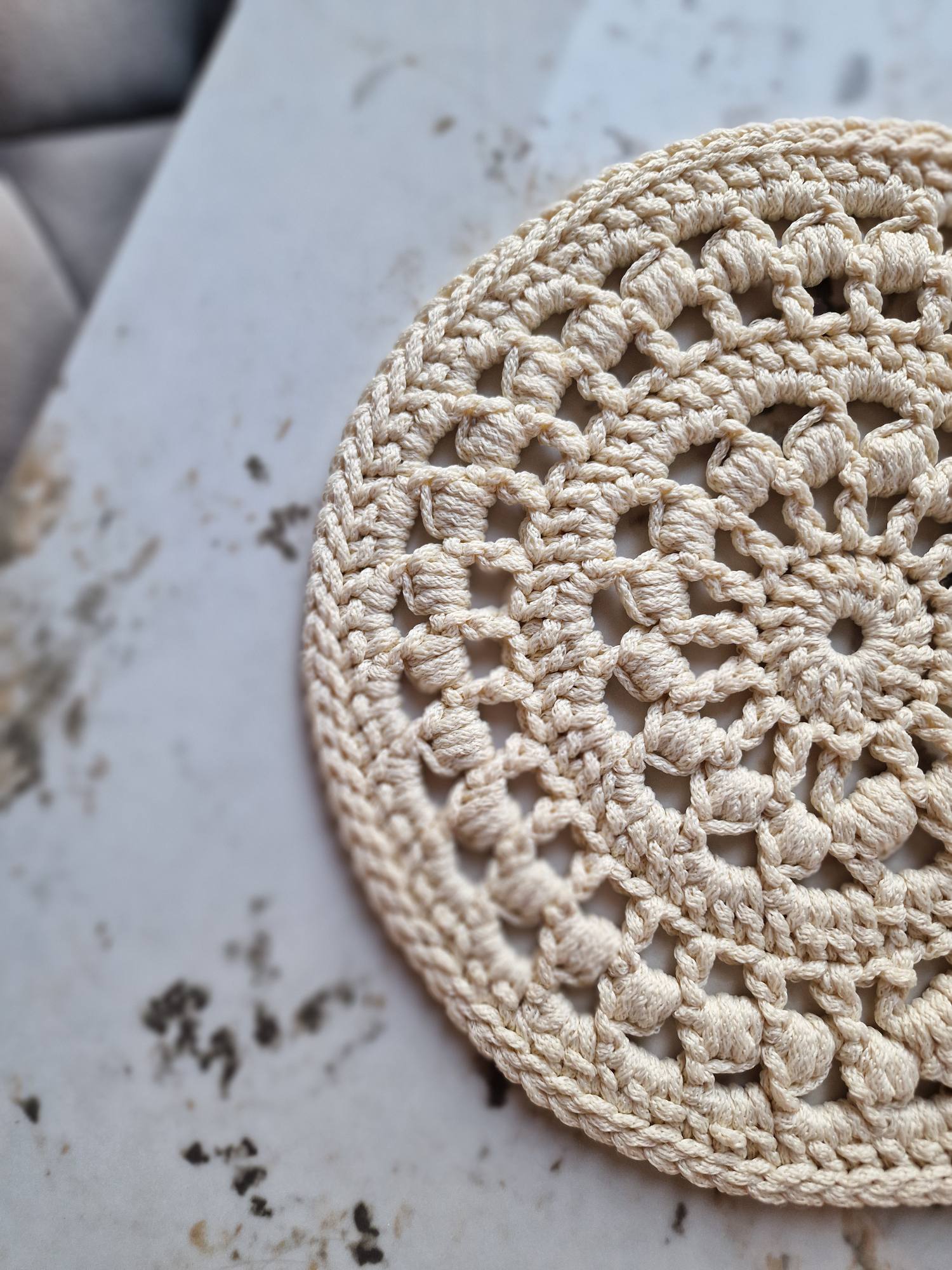 Šis rankų darbo padėkliukas nertas iš 3mm poliesterio virvės, todėl yra tvirtas, ilgaamžis. Kruopščiai nertas raštas suteikia jaukumo ir subtilios elegancijos jūsų namams.