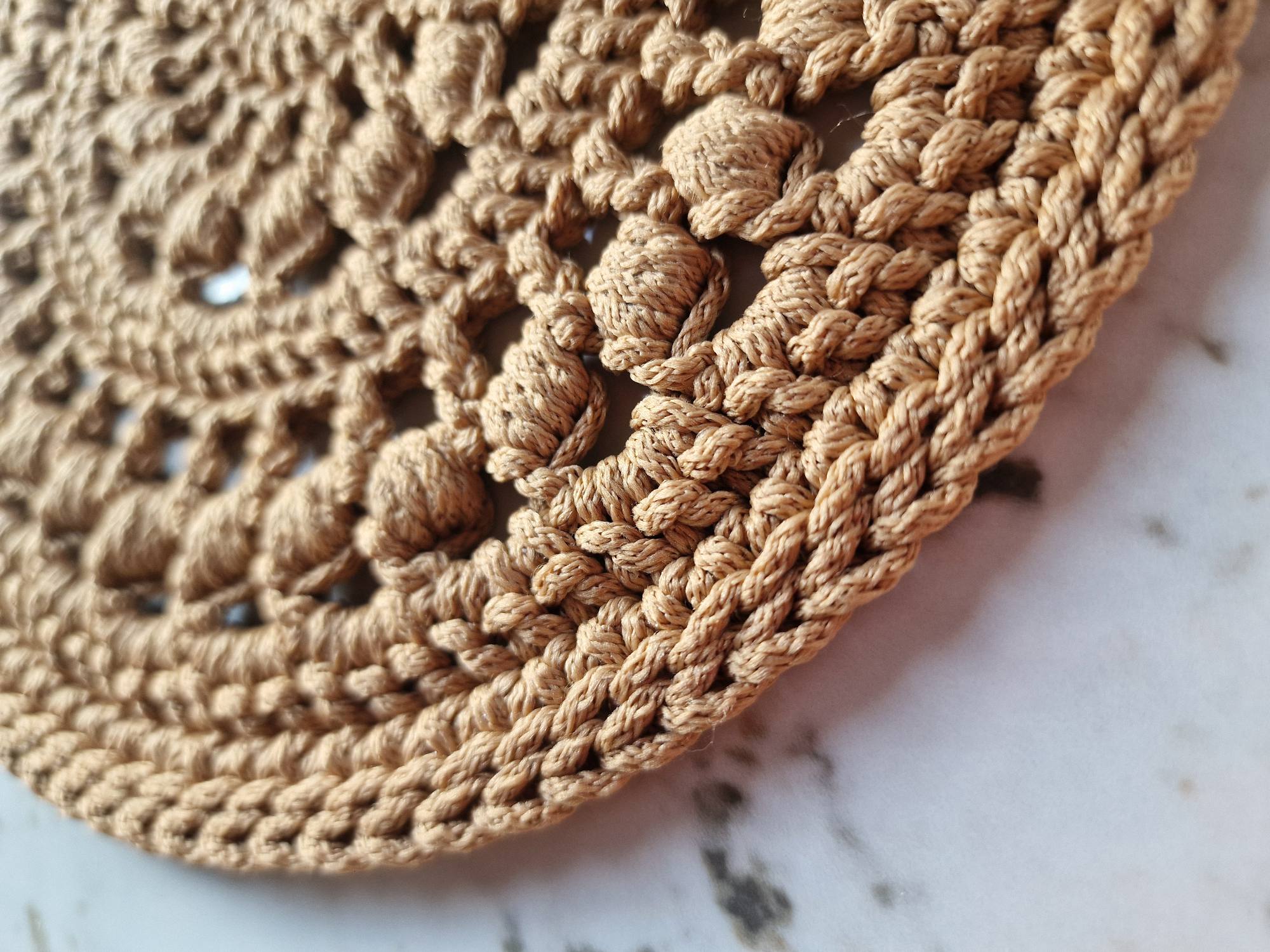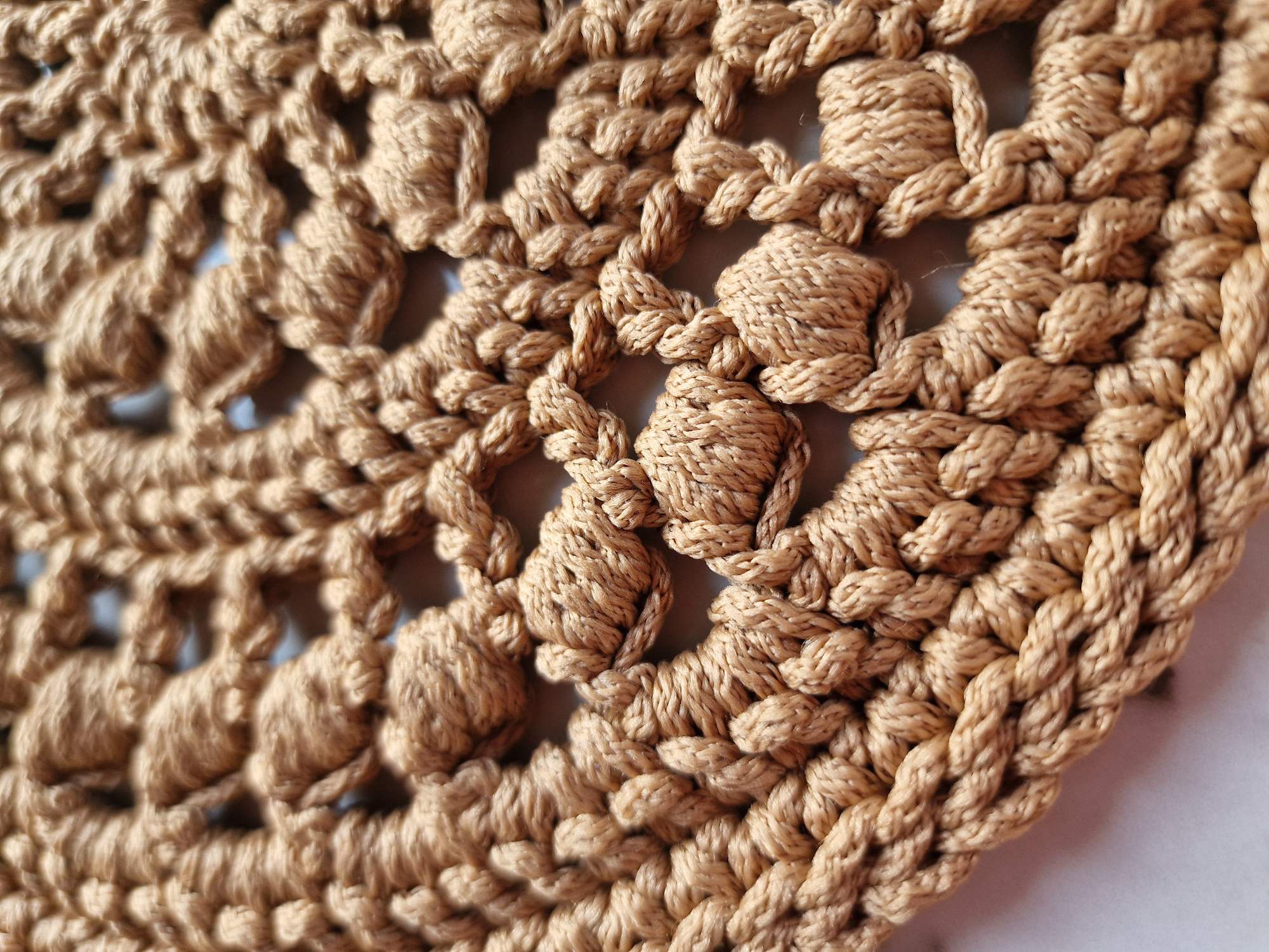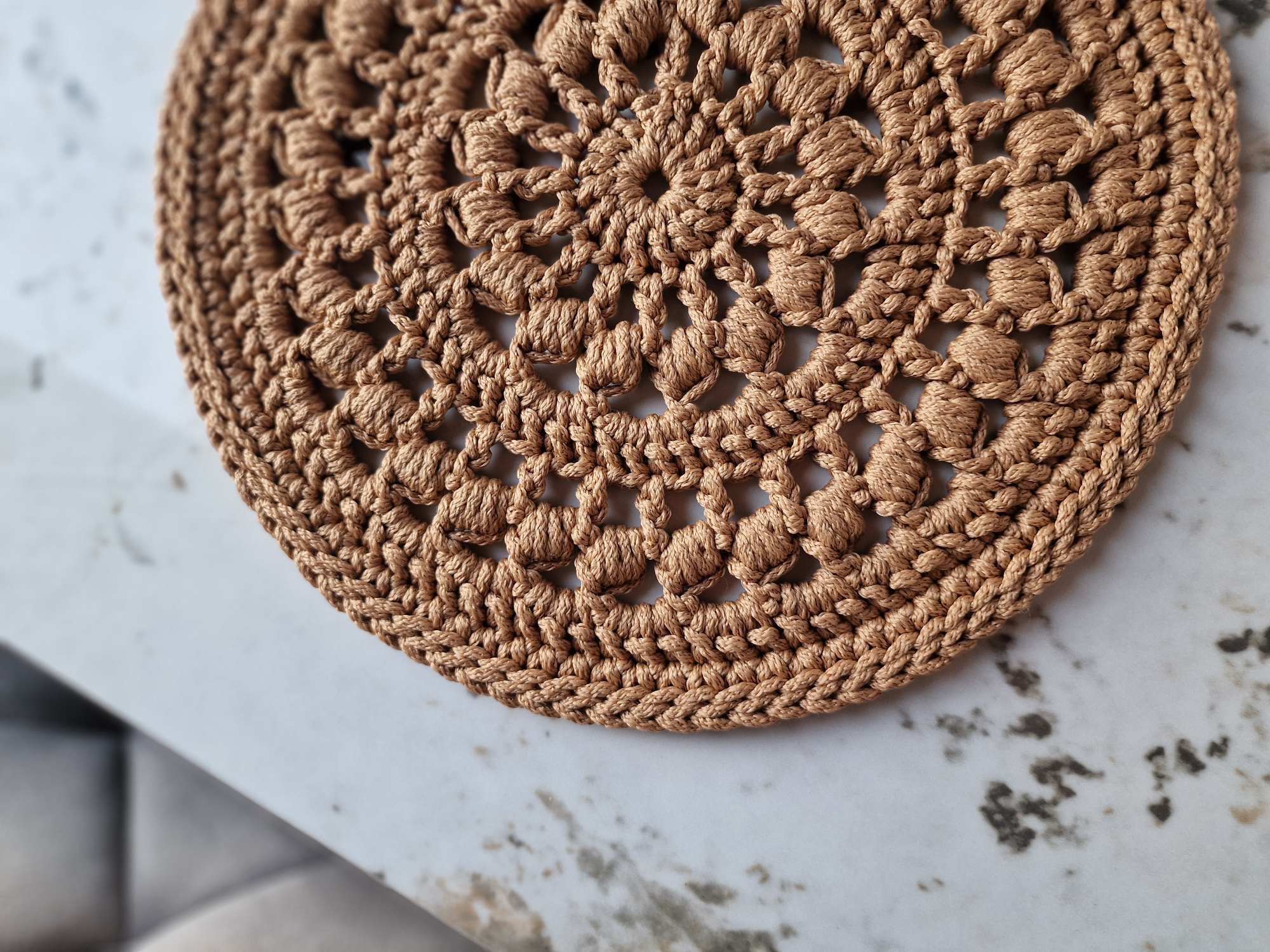 Šis rankų darbo padėkliukas nertas iš 3mm poliesterio virvės, todėl yra tvirtas, ilgaamžis. Kruopščiai nertas raštas suteikia jaukumo ir subtilios elegancijos jūsų namams.