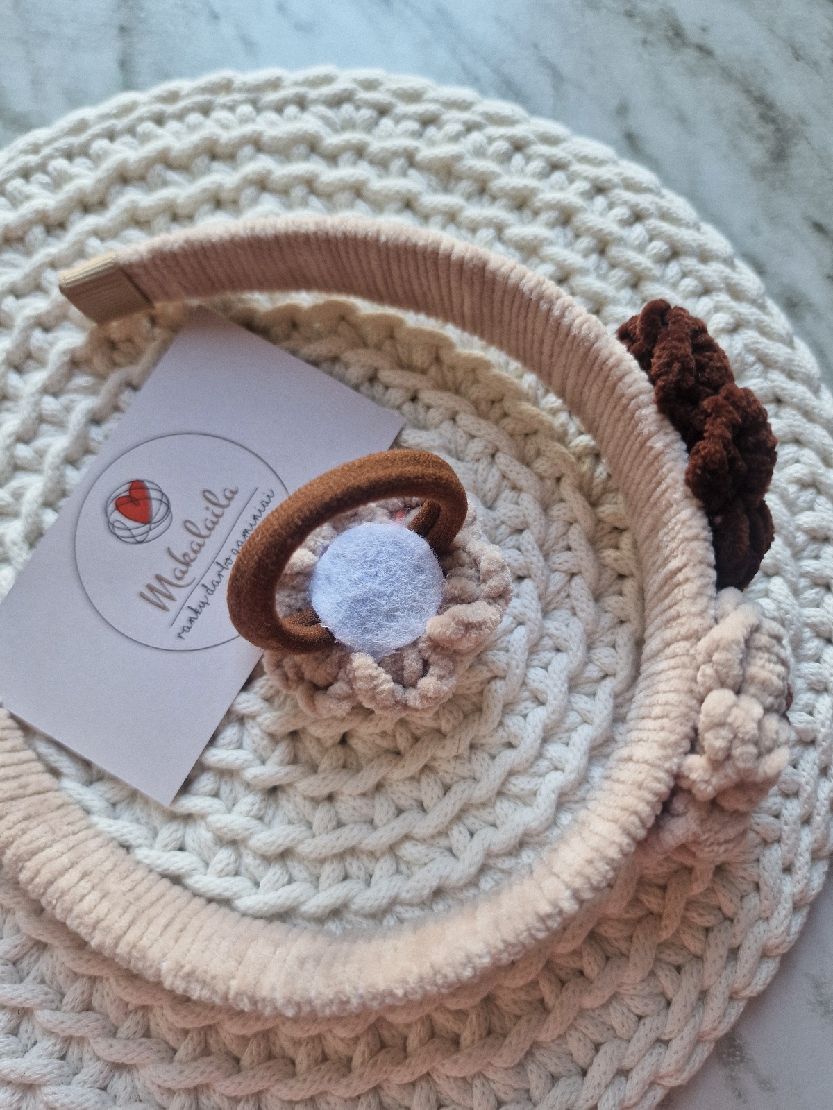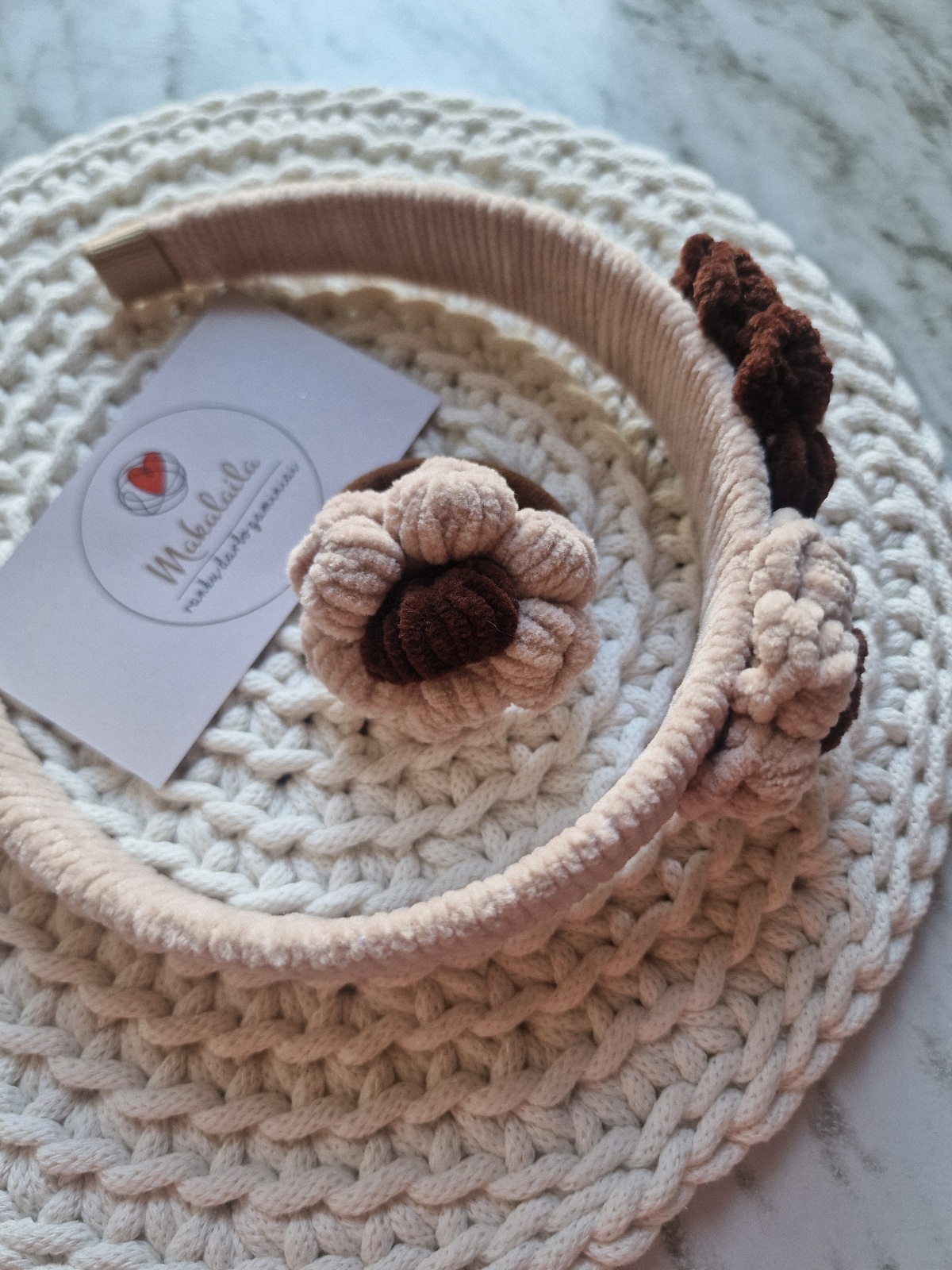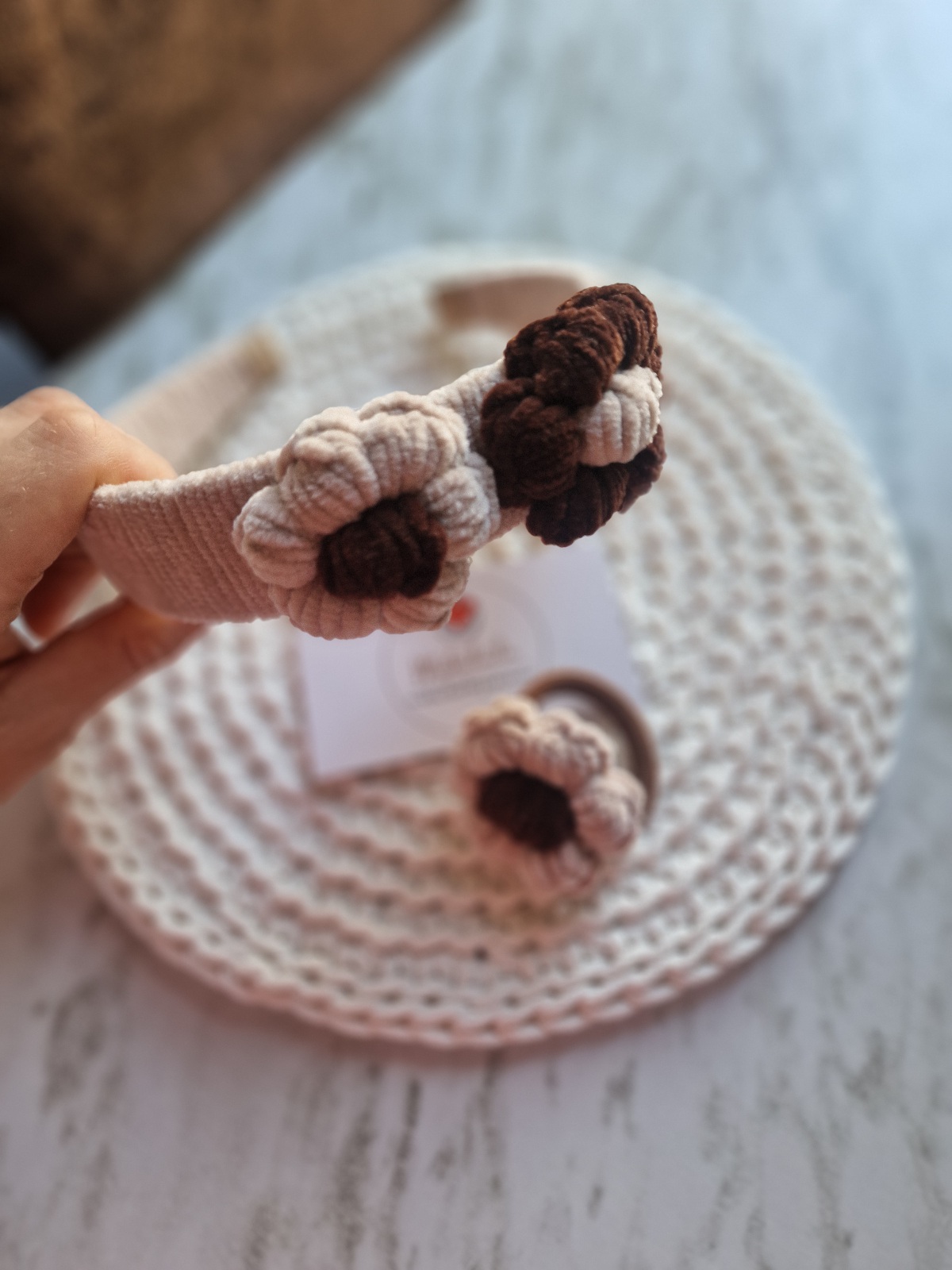 Suderintas aksesuarų rinkinys – ryškus, žaismingas ir išskirtinis! Rankų darbo lankelis su dviem nertomis gėlytėmis ir 1vnt. plaukų gumele – visa tai, ko reikia mažajai damutei ypatingai dienai ar kasdieniam pasipuošimui!