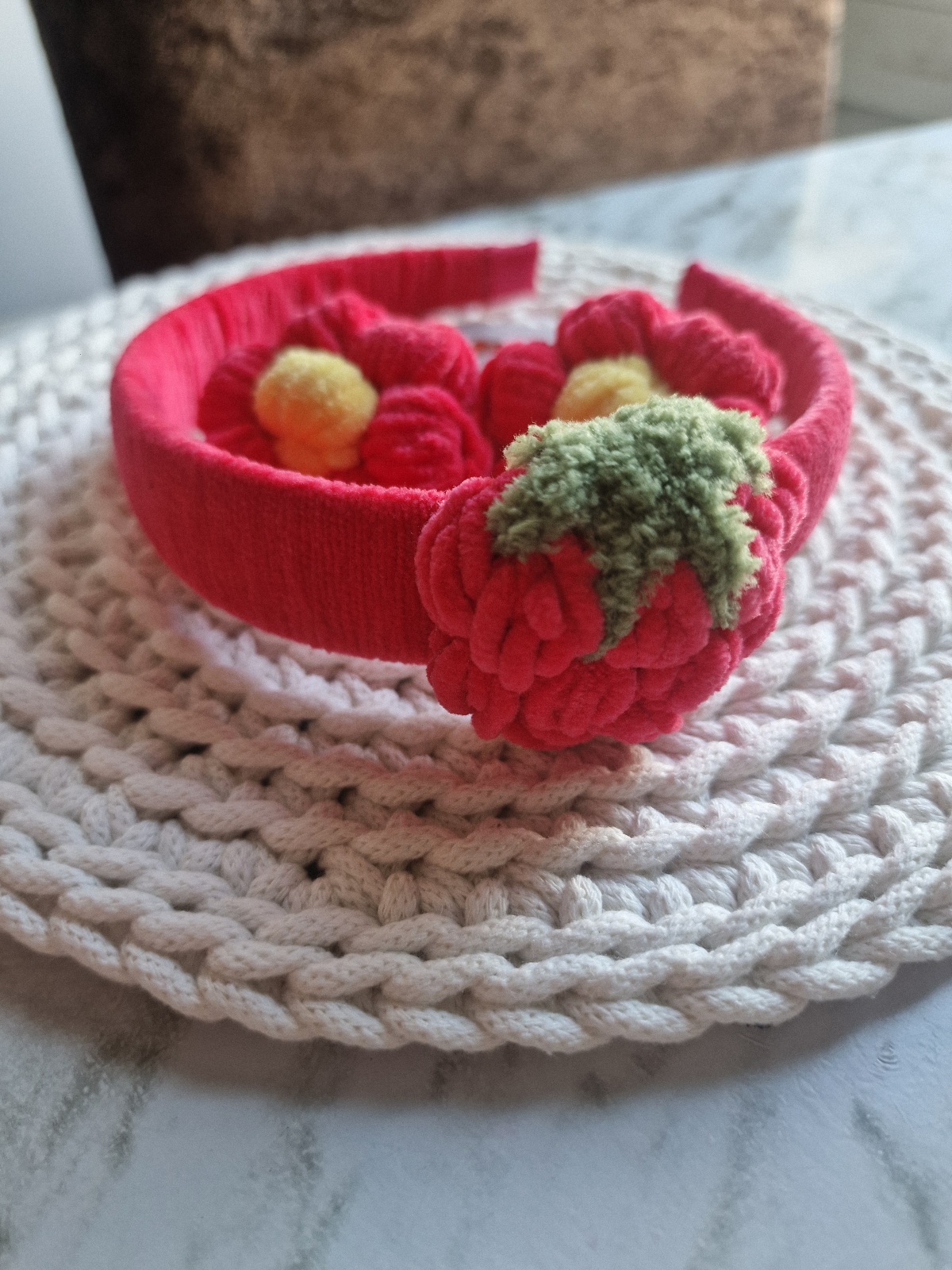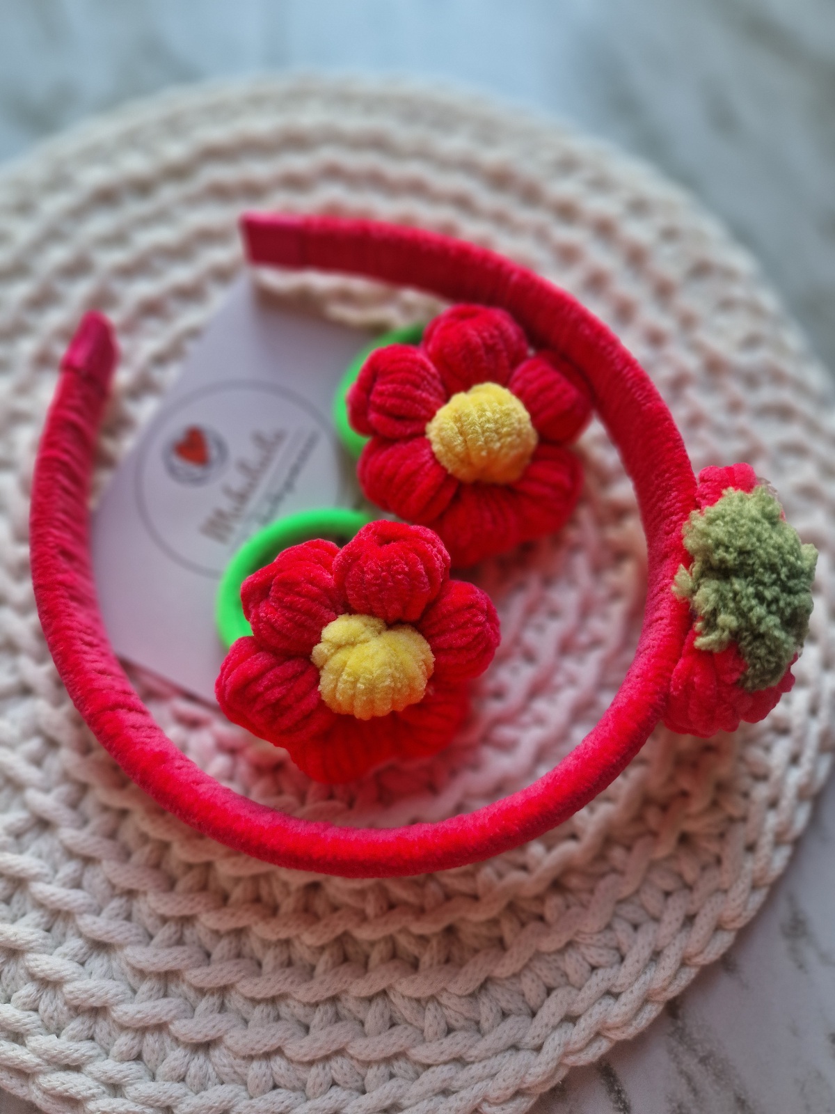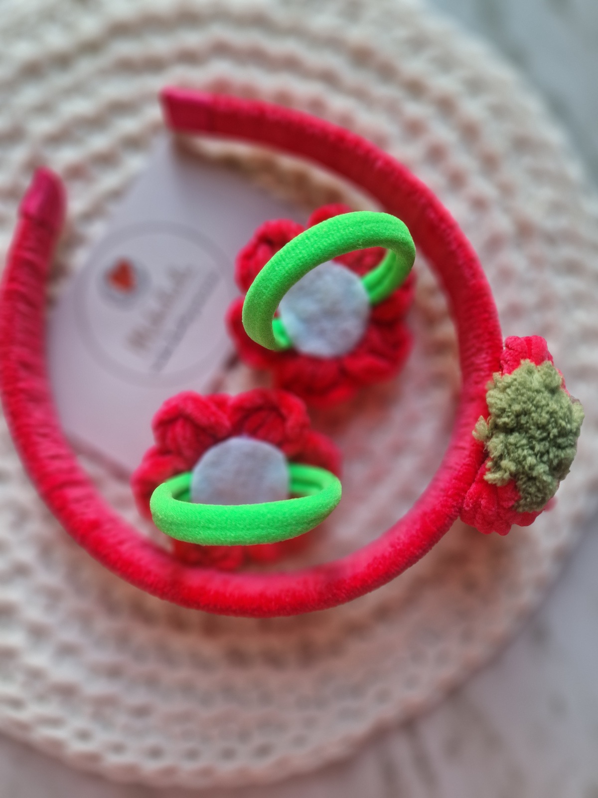 Suderintas aksesuarų rinkinys – ryškus, žaismingas ir išskirtinis! Rankų darbo lankelis su nerta braške ir 2vnt. plaukų gumelių – visa tai, ko reikia mažajai damutei ypatingai dienai ar kasdieniam pasipuošimui!