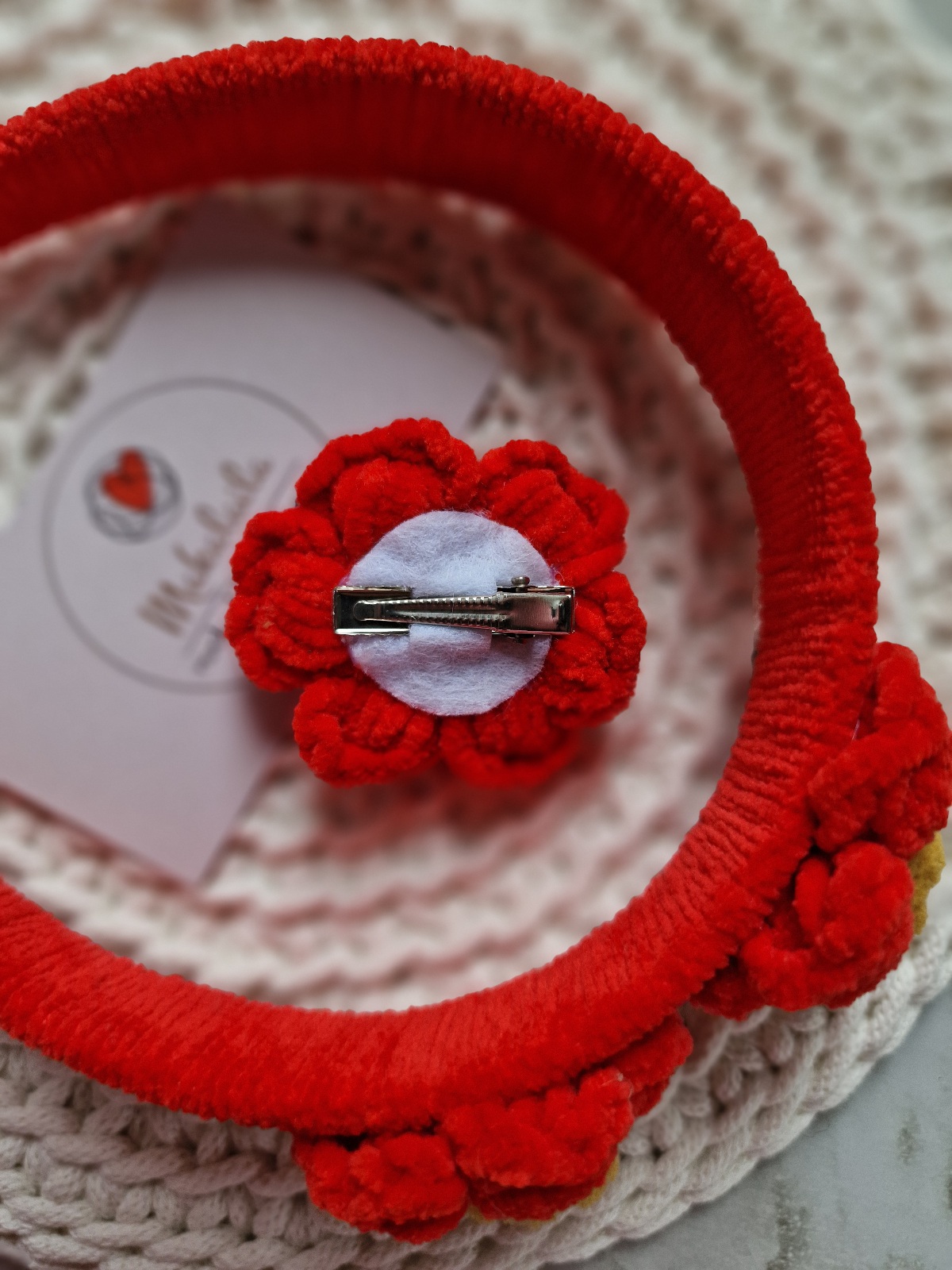 Suderintas aksesuarų rinkinys – ryškus, žaismingas ir išskirtinis! Rankų darbo lankelis su dviem nertomis gėlytėmis ir 1vnt. plaukų sege – visa tai, ko reikia mažajai damutei ypatingai dienai ar kasdieniam pasipuošimui!