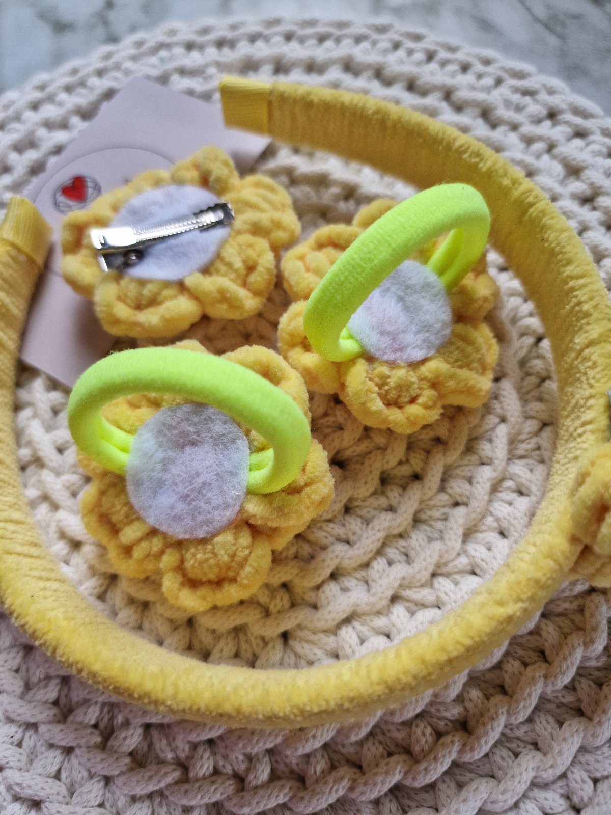 Suderintas aksesuarų rinkinys – ryškus, žaismingas ir išskirtinis! Rankų darbo lankelis su nerta braške ir 2vnt. plaukų gumelių, 1vnt. sege – visa tai, ko reikia mažajai damutei ypatingai dienai ar kasdieniam pasipuošimui!