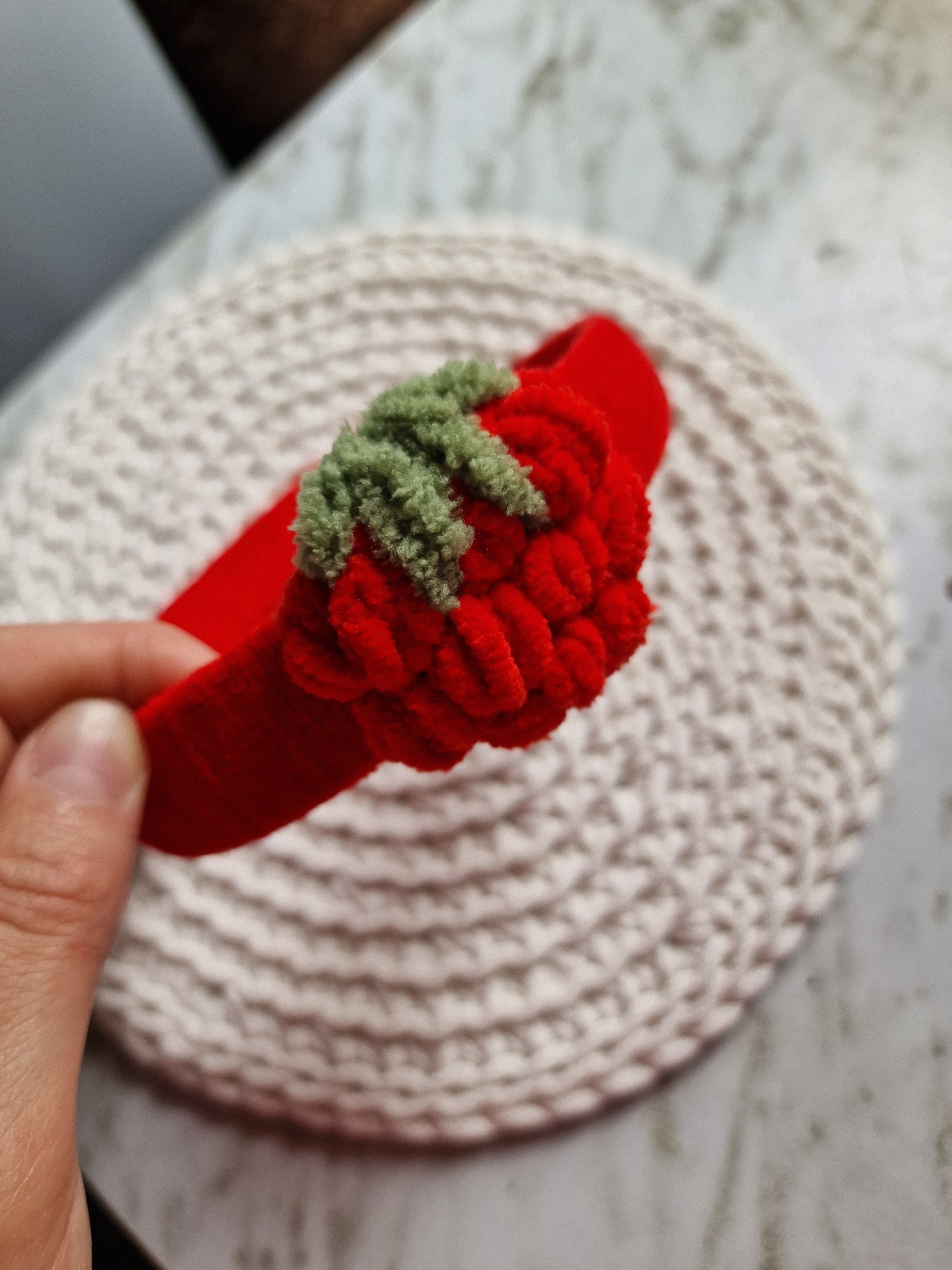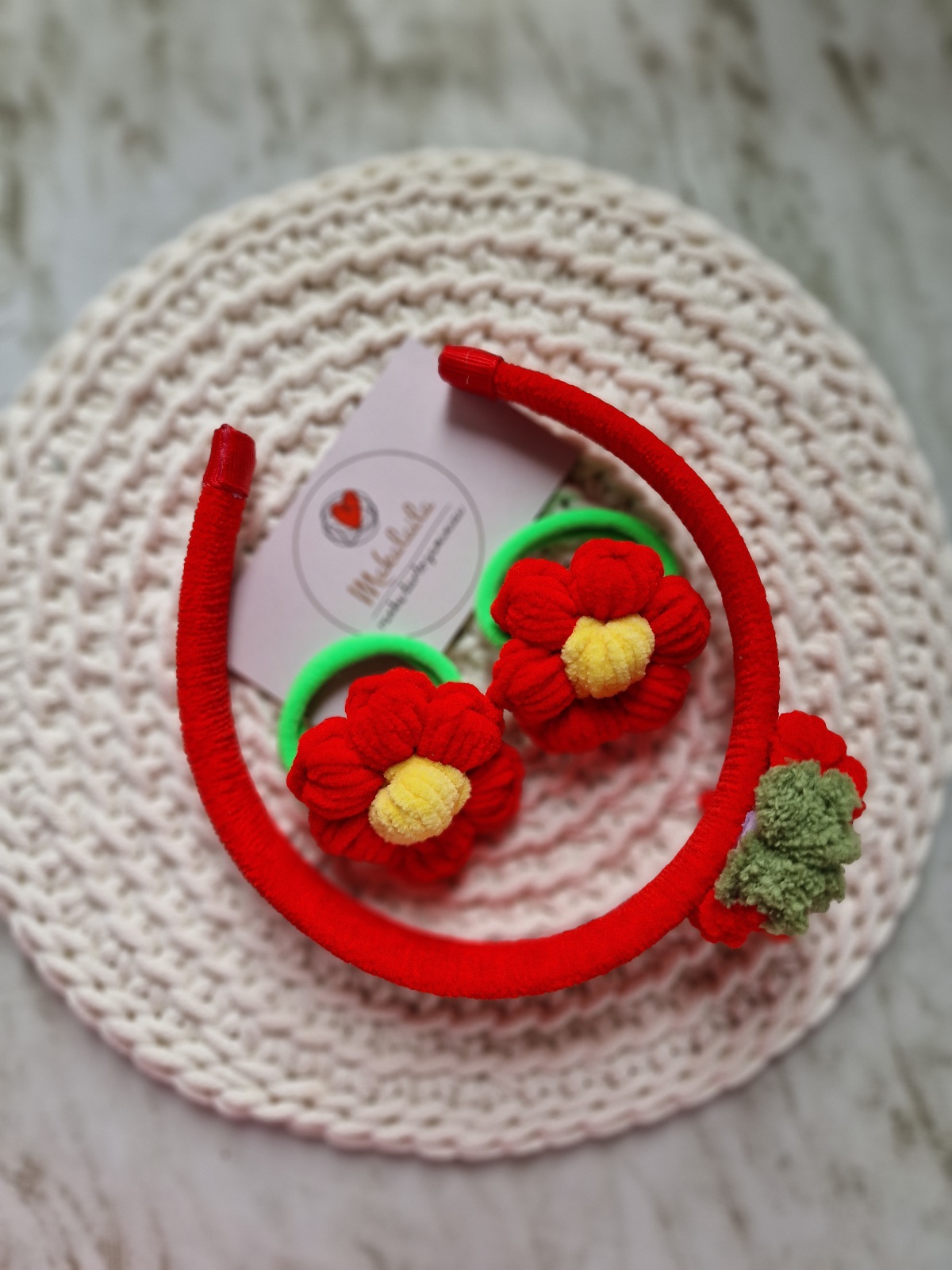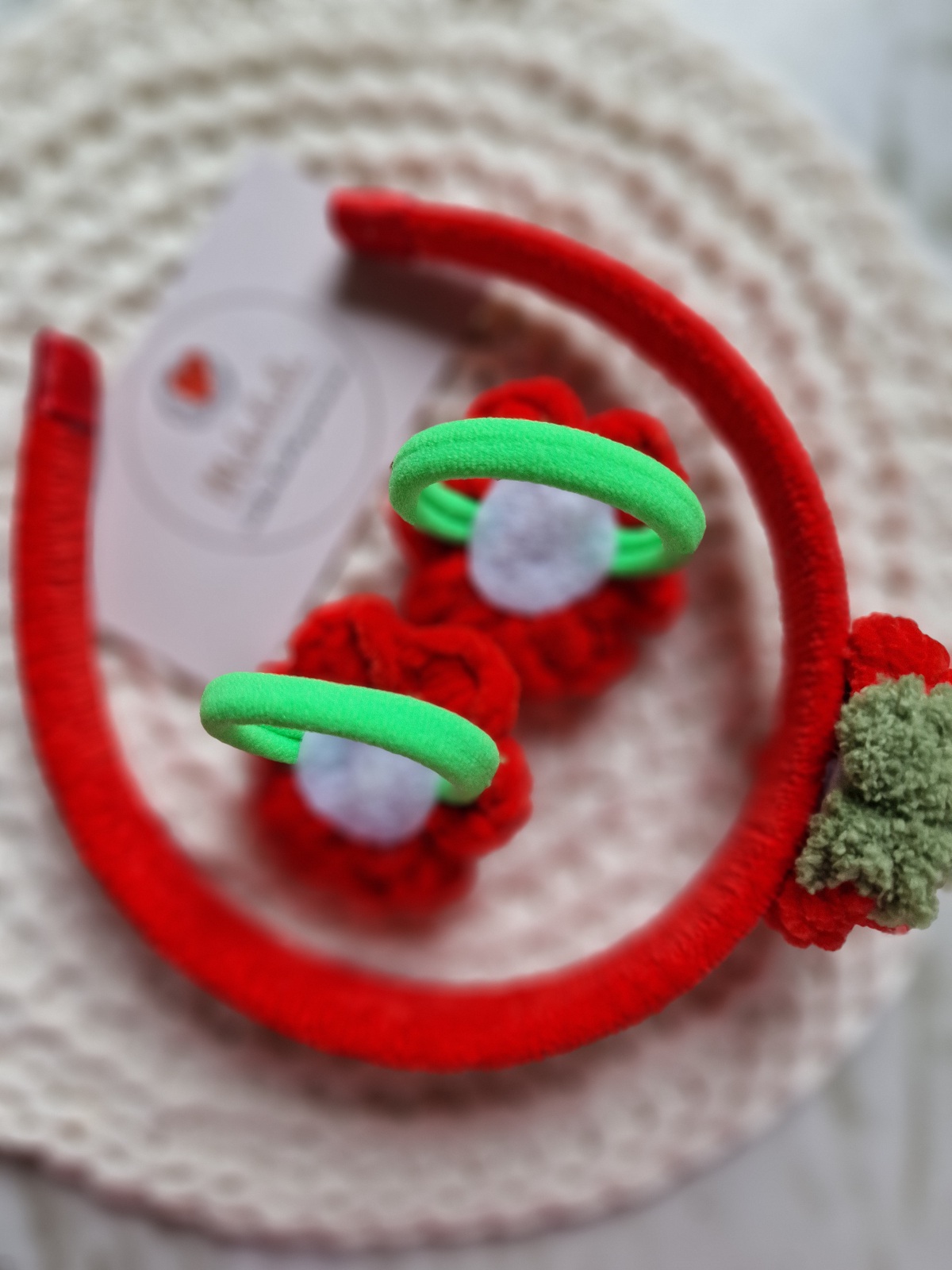 Suderintas aksesuarų rinkinys – ryškus, žaismingas ir išskirtinis! Rankų darbo lankelis su nerta braške ir 2vnt. plaukų gumelių – visa tai, ko reikia mažajai damutei ypatingai dienai ar kasdieniam pasipuošimui!