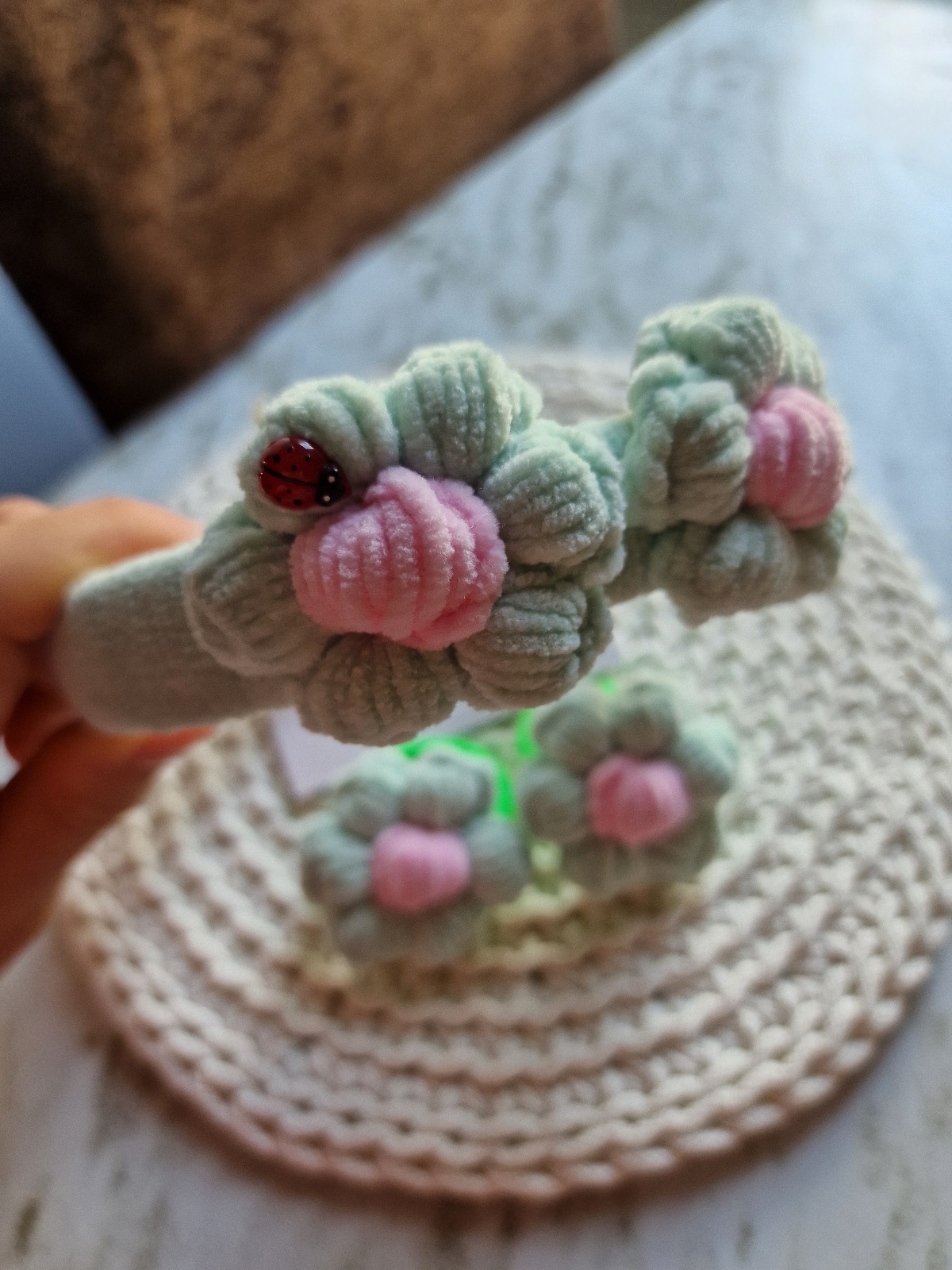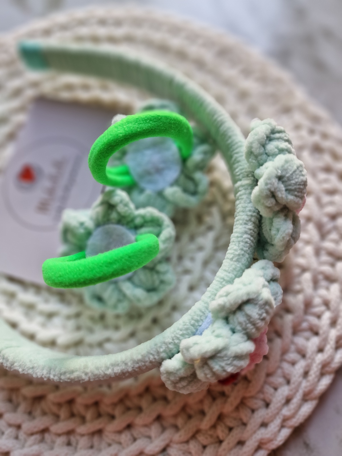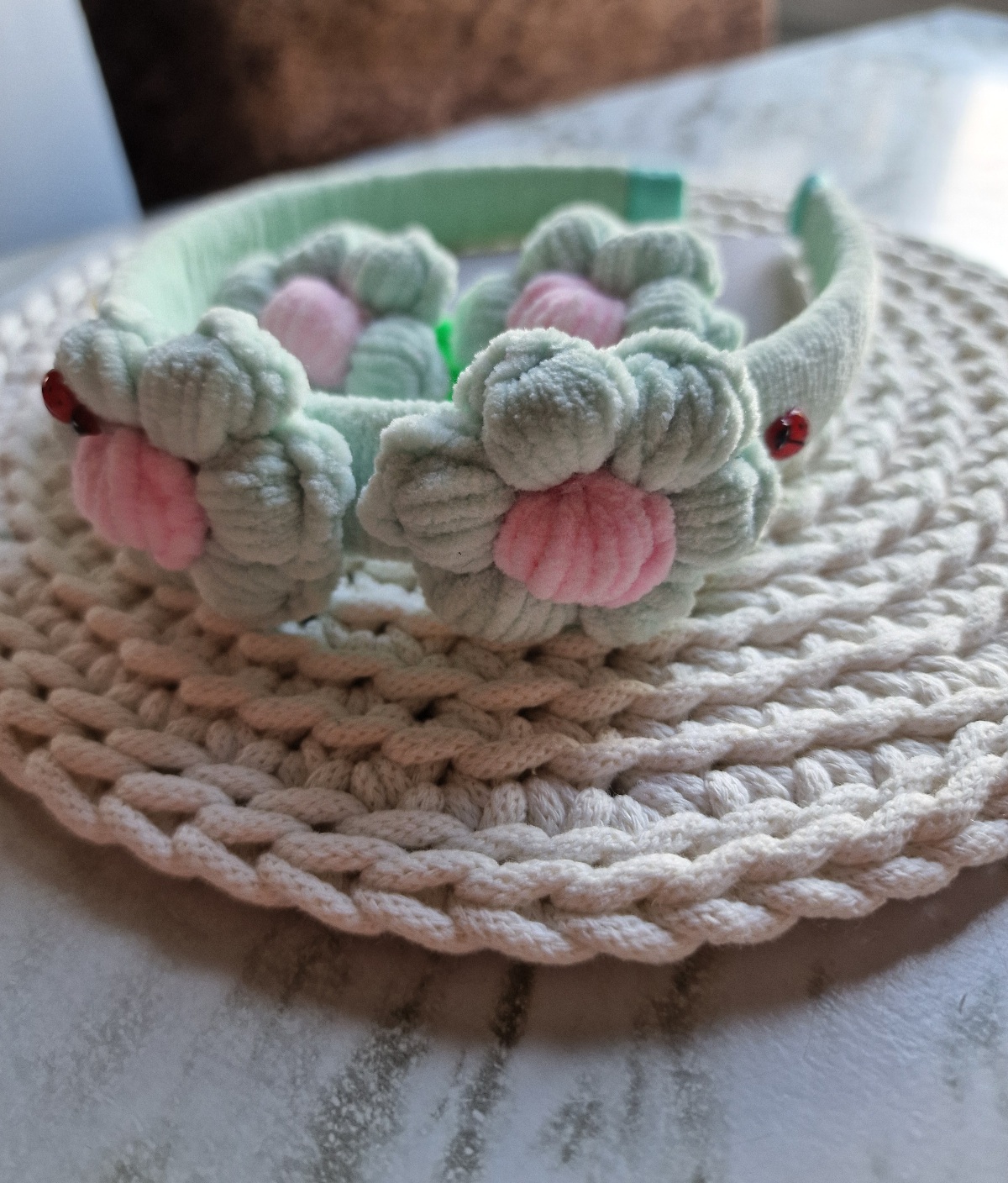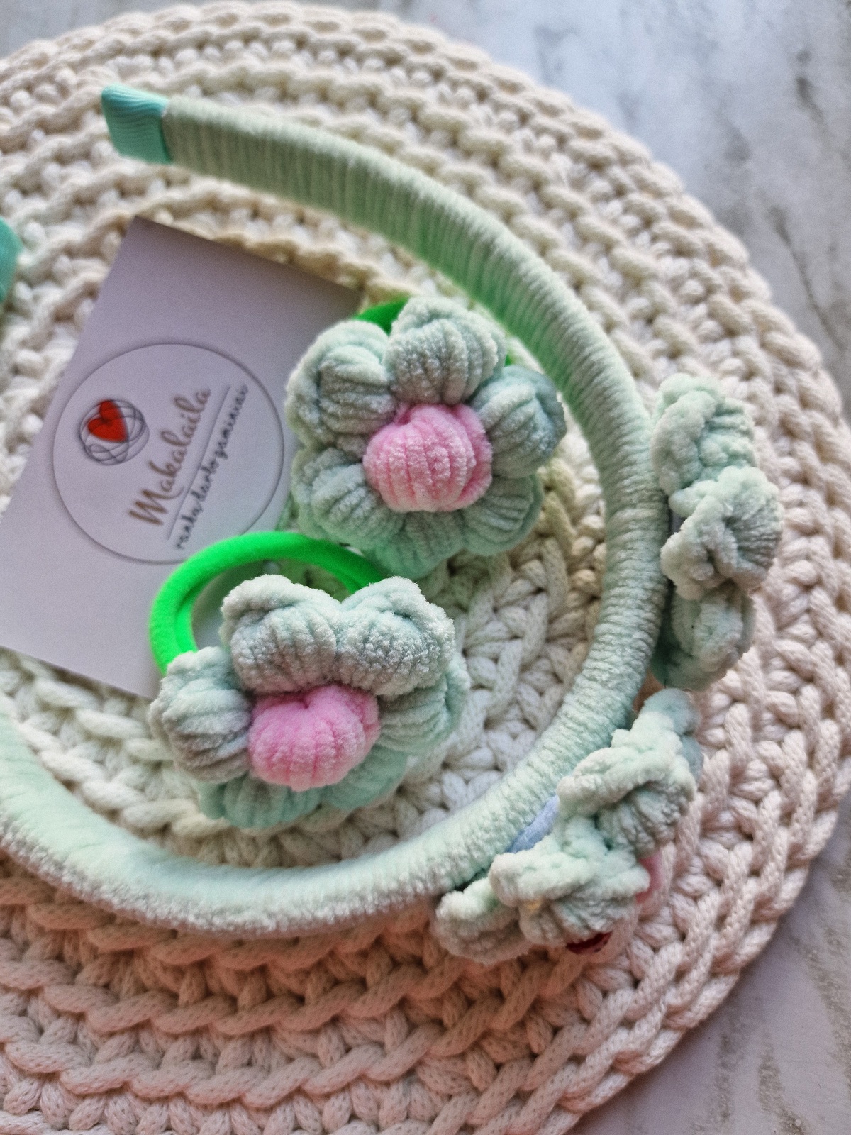 Suderintas aksesuarų rinkinys – ryškus, žaismingas ir išskirtinis! Rankų darbo lankelis su dviem nertomis gėlytėmis, boružėlėmis ir 2vnt. plaukų gumelių – visa tai, ko reikia mažajai damutei ypatingai dienai ar kasdieniam pasipuošimui!