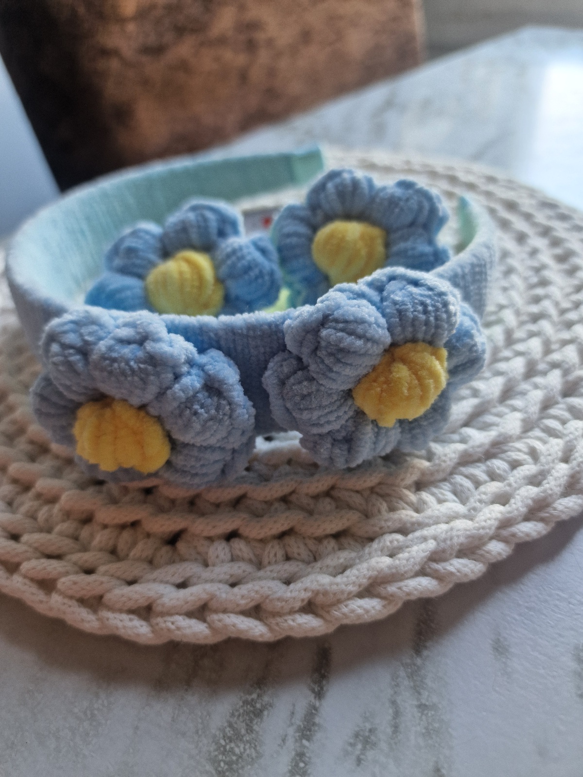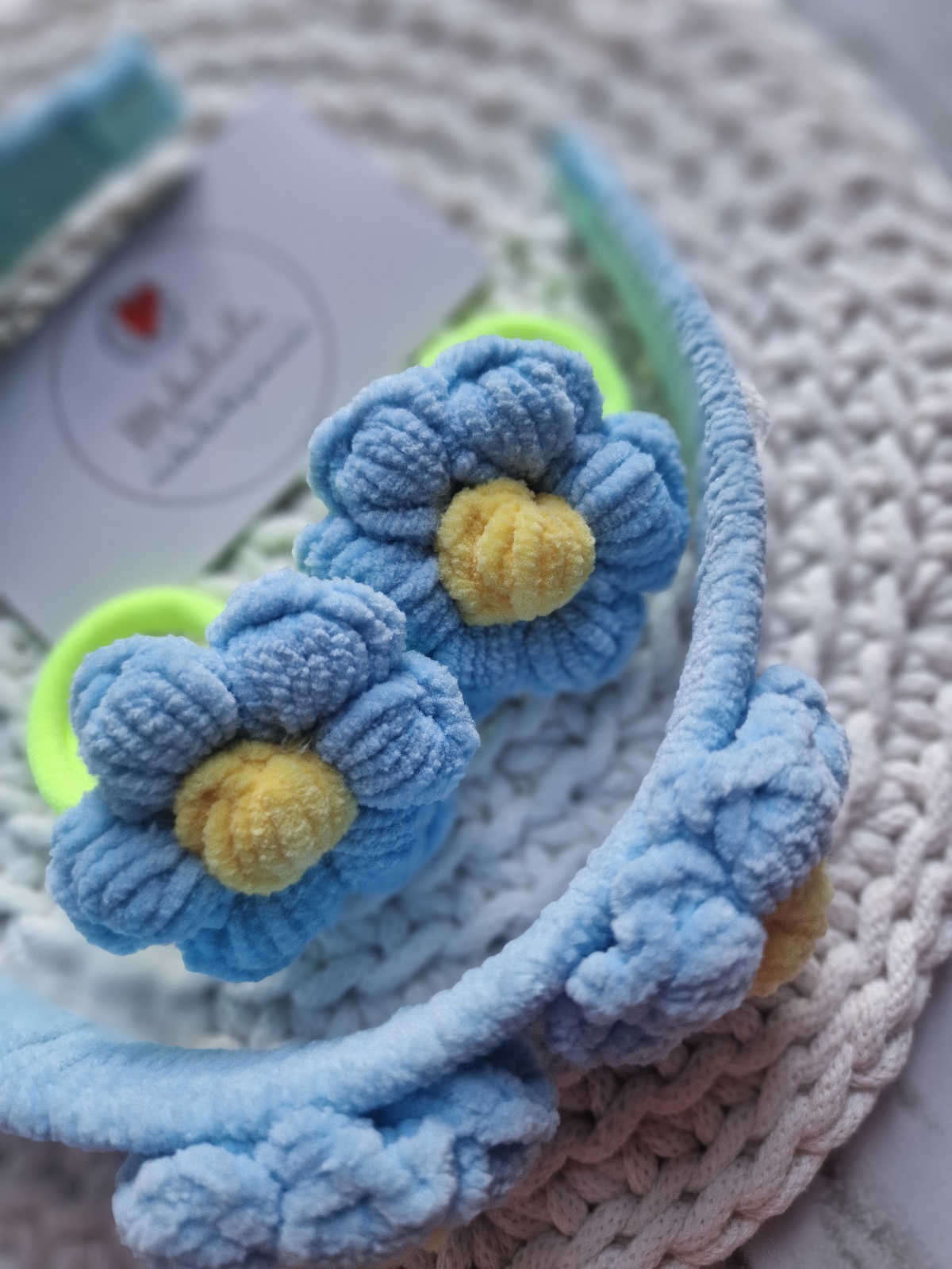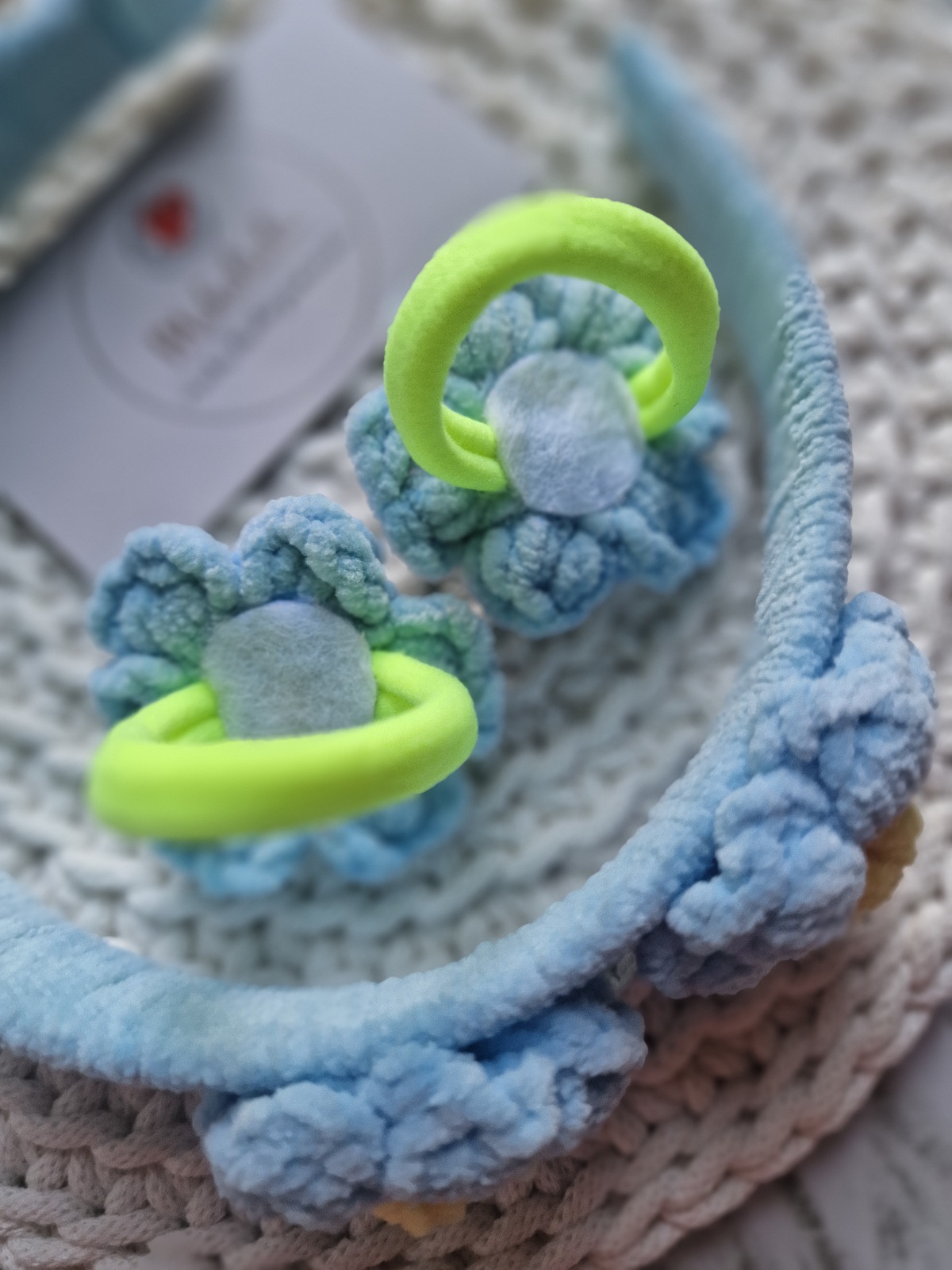Suderintas aksesuarų rinkinys – ryškus, žaismingas ir išskirtinis! Rankų darbo lankelis su dviem nertomis gėlytėmis ir 2vnt. plaukų gumelių – visa tai, ko reikia mažajai damutei ypatingai dienai ar kasdieniam pasipuošimui!