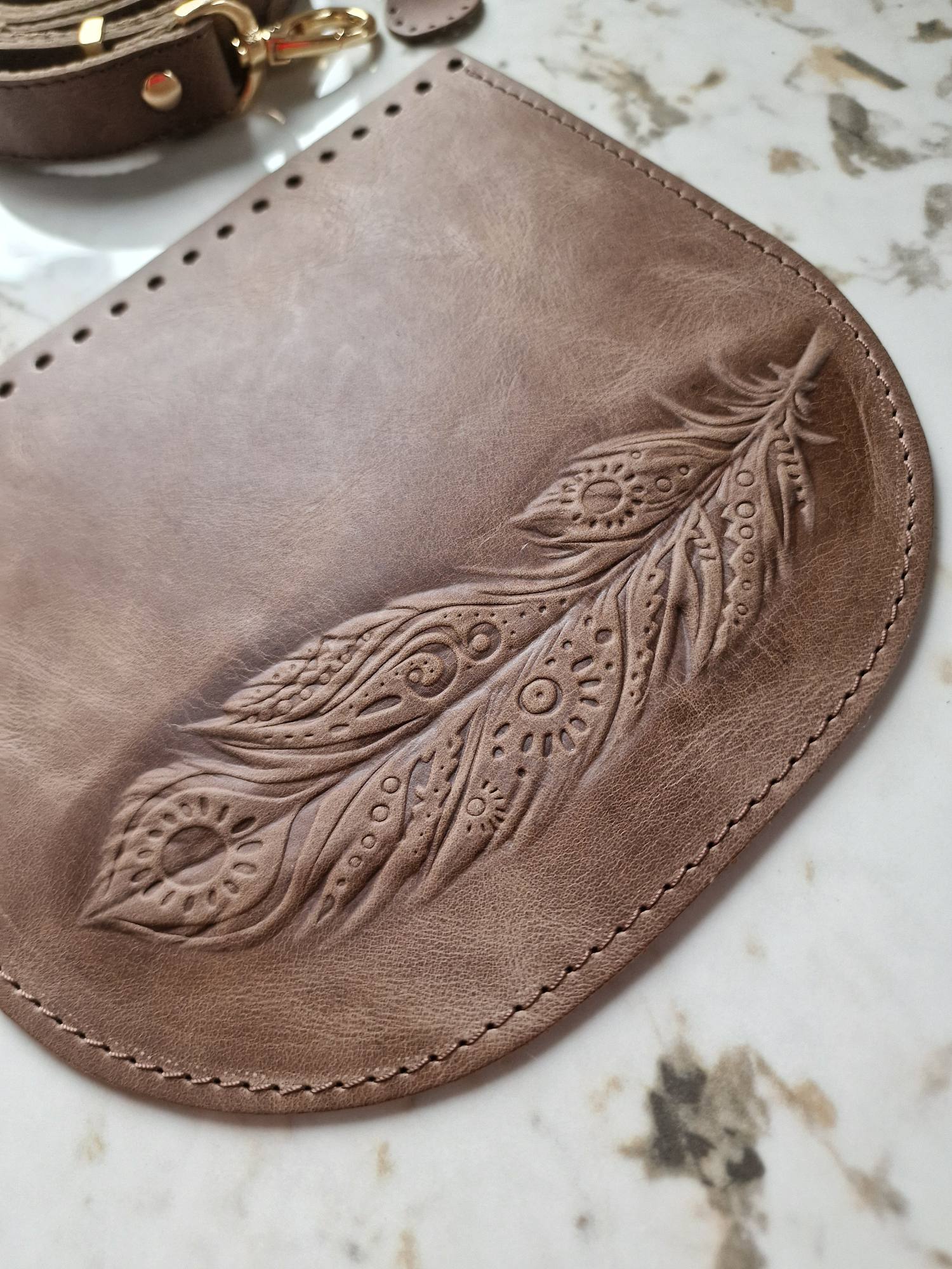 Rudos spalvos odinis atvartas nertai rankinei įspaudu „Plunksna“ – tai išskirtinė detalė, kuri sujungia tvirtumą, jaukumą ir kūrybos lengvumą.