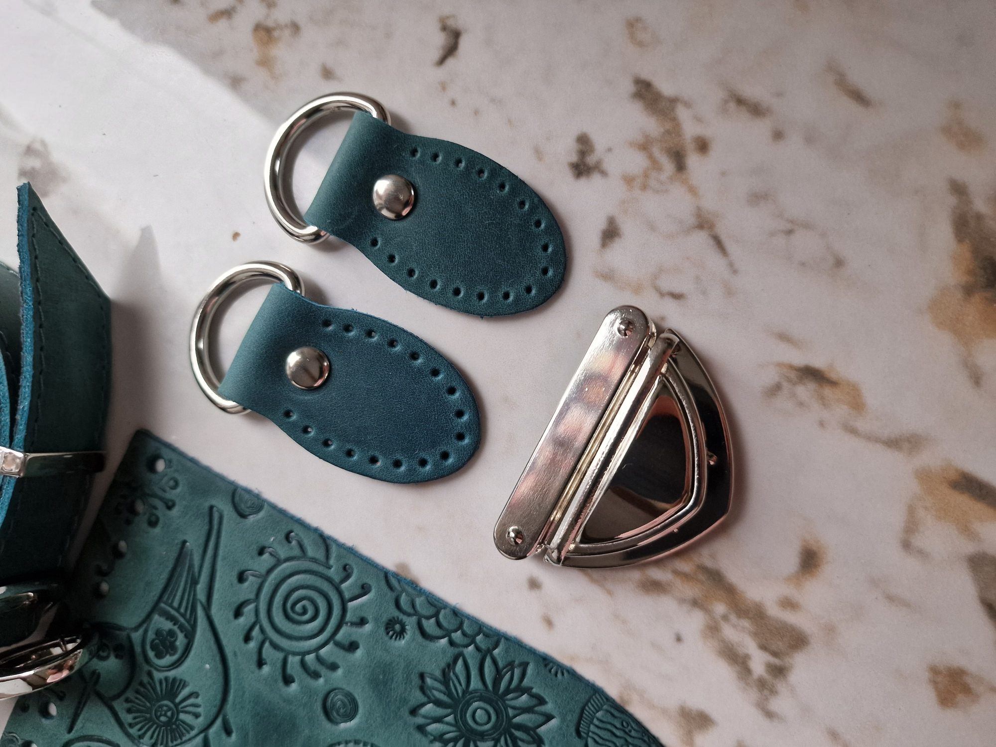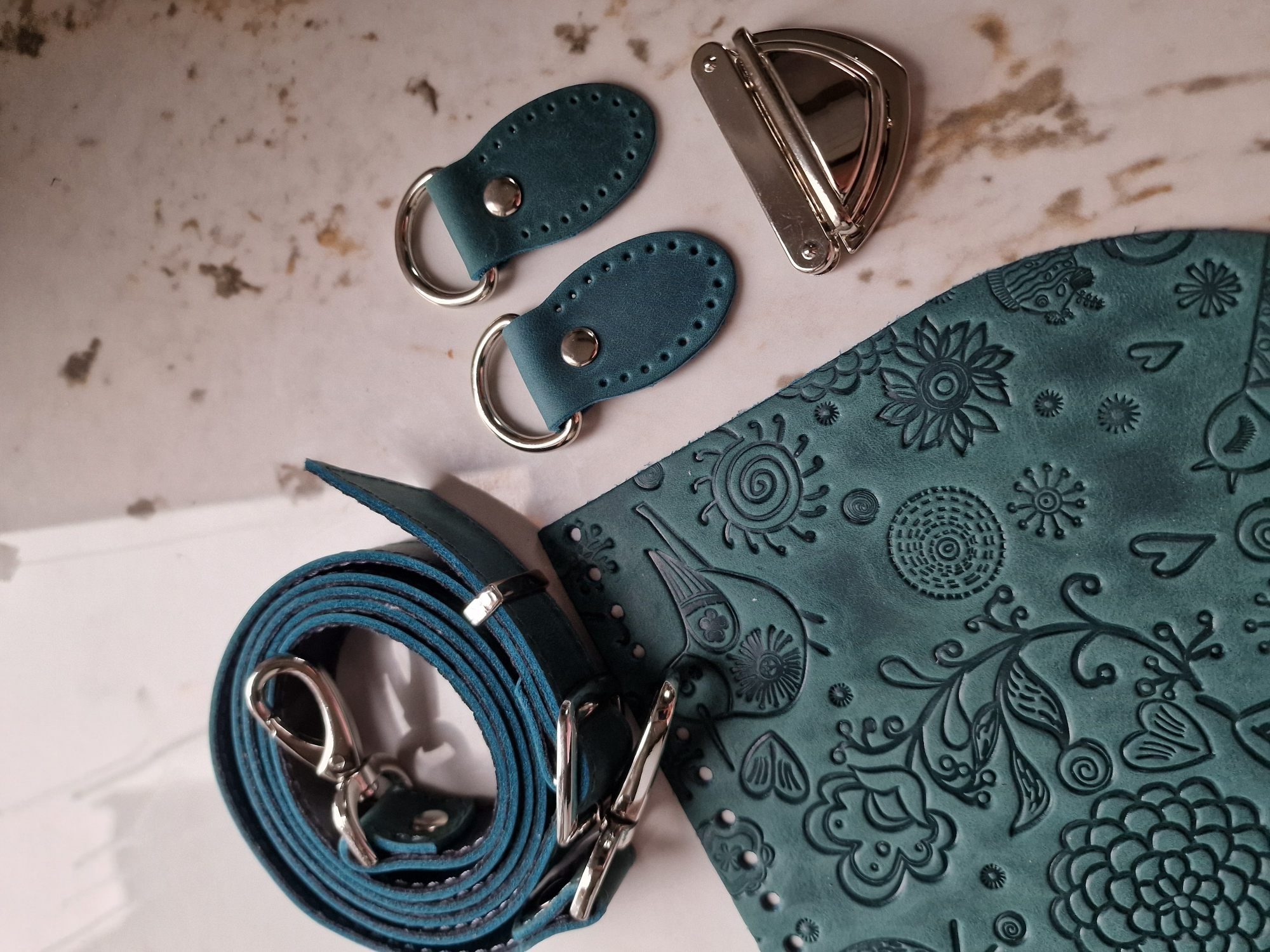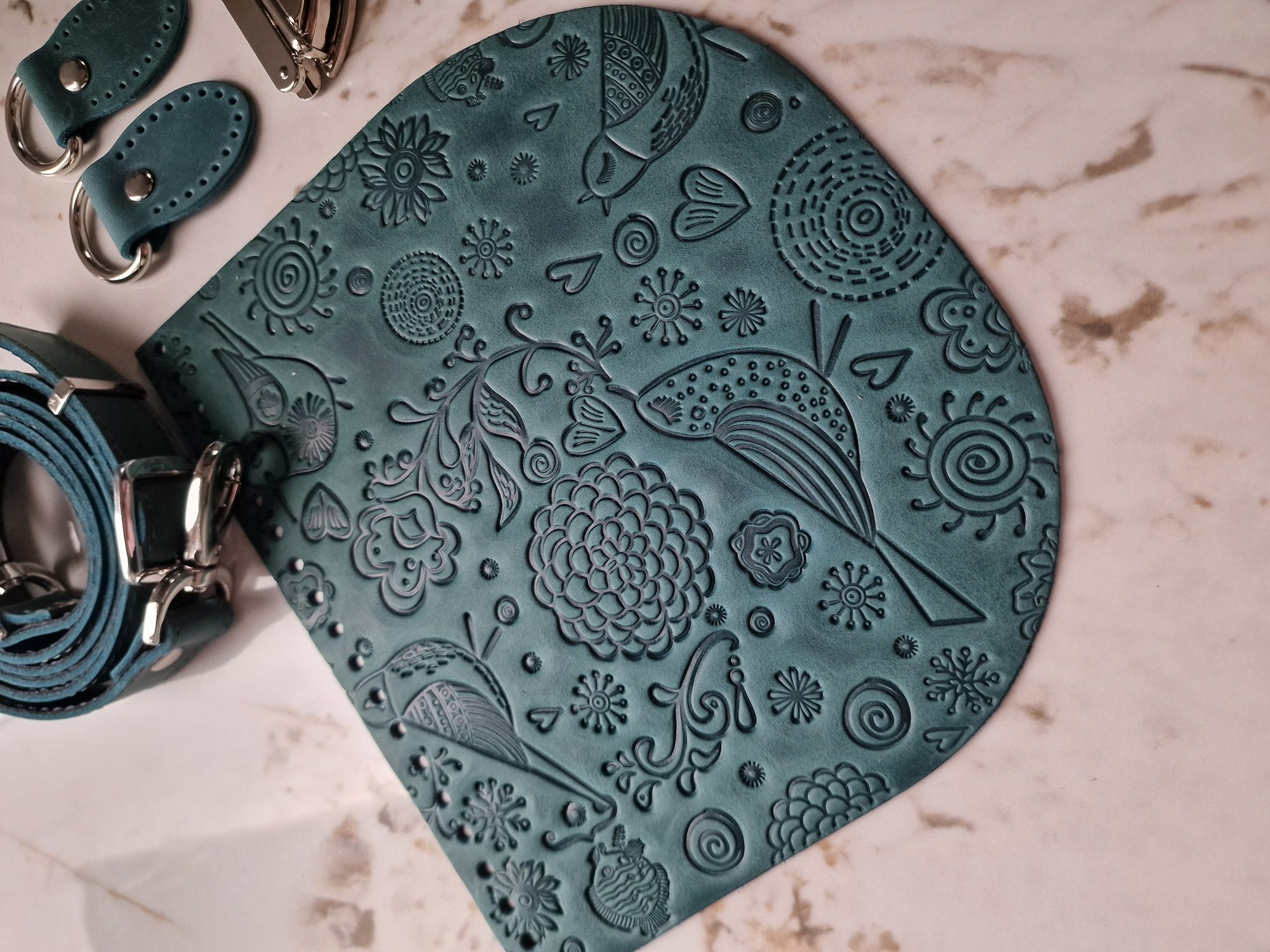 Žalios spalvos odinis rinkinys rankinei su augalų ir paukščių įspaudais – subtilus, elegantiškas ir išskirtinis. Komplekte yra viršelis, 2vnt. šoninių tvirtinimo detalių su žiedeliais(~3x7cm), ilga reguliuojama rankena, metalinis užsegimas.