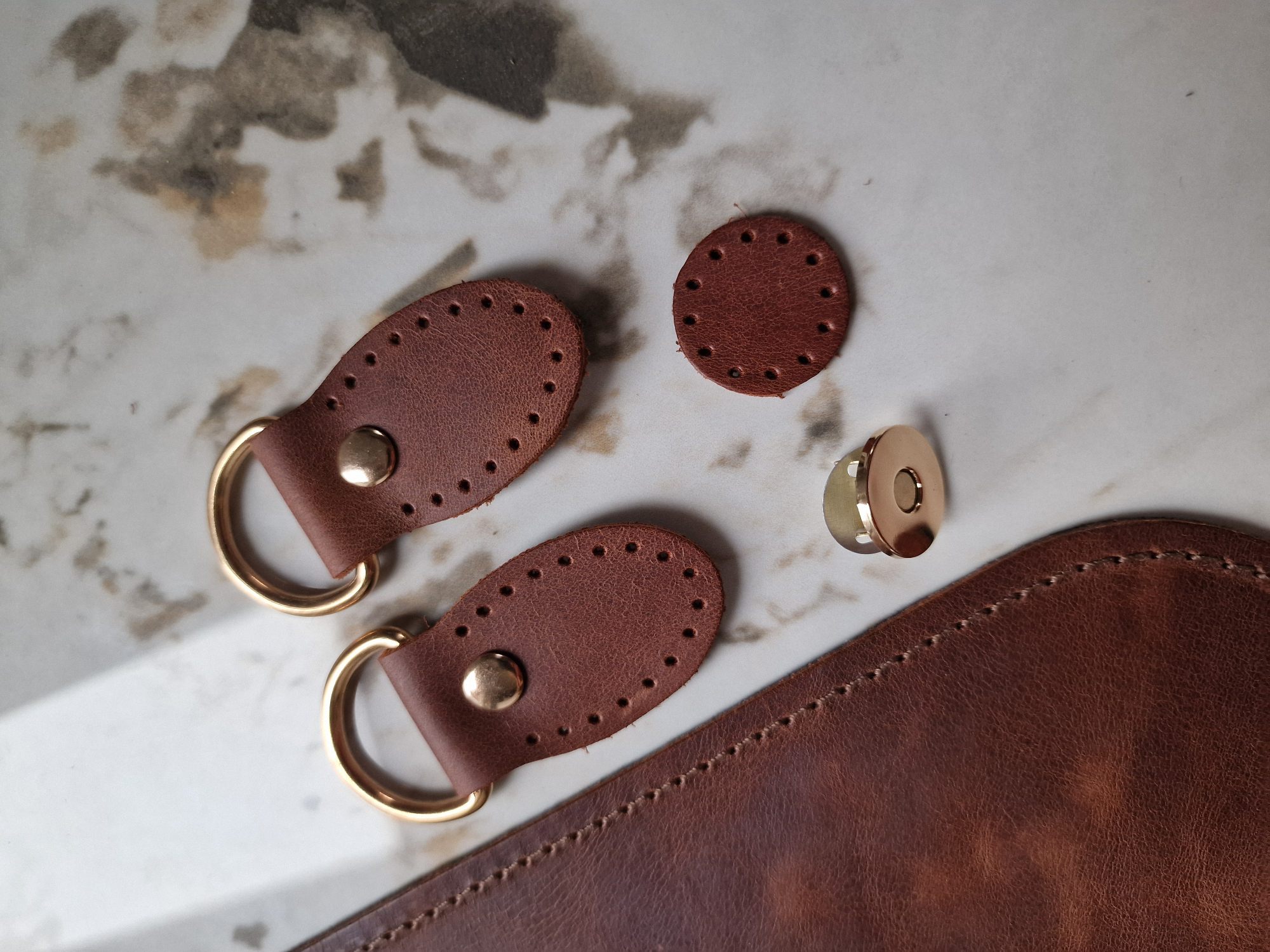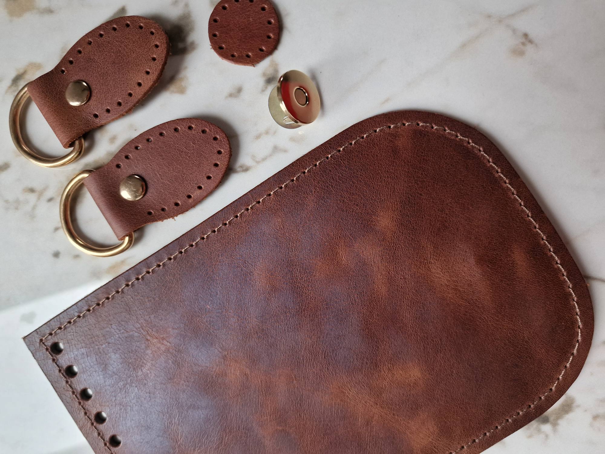 Tamsiai rudos spalvos odinis rinkinys rankinei – subtilus, elegantiškas ir išskirtinis. Komplekte yra viršelis, magnetinis užsegimas ir prisiuvama nugarėlė užsegimui, 2vnt. šoninių tvirtinimo detalių su žiedeliais(~3x7cm).