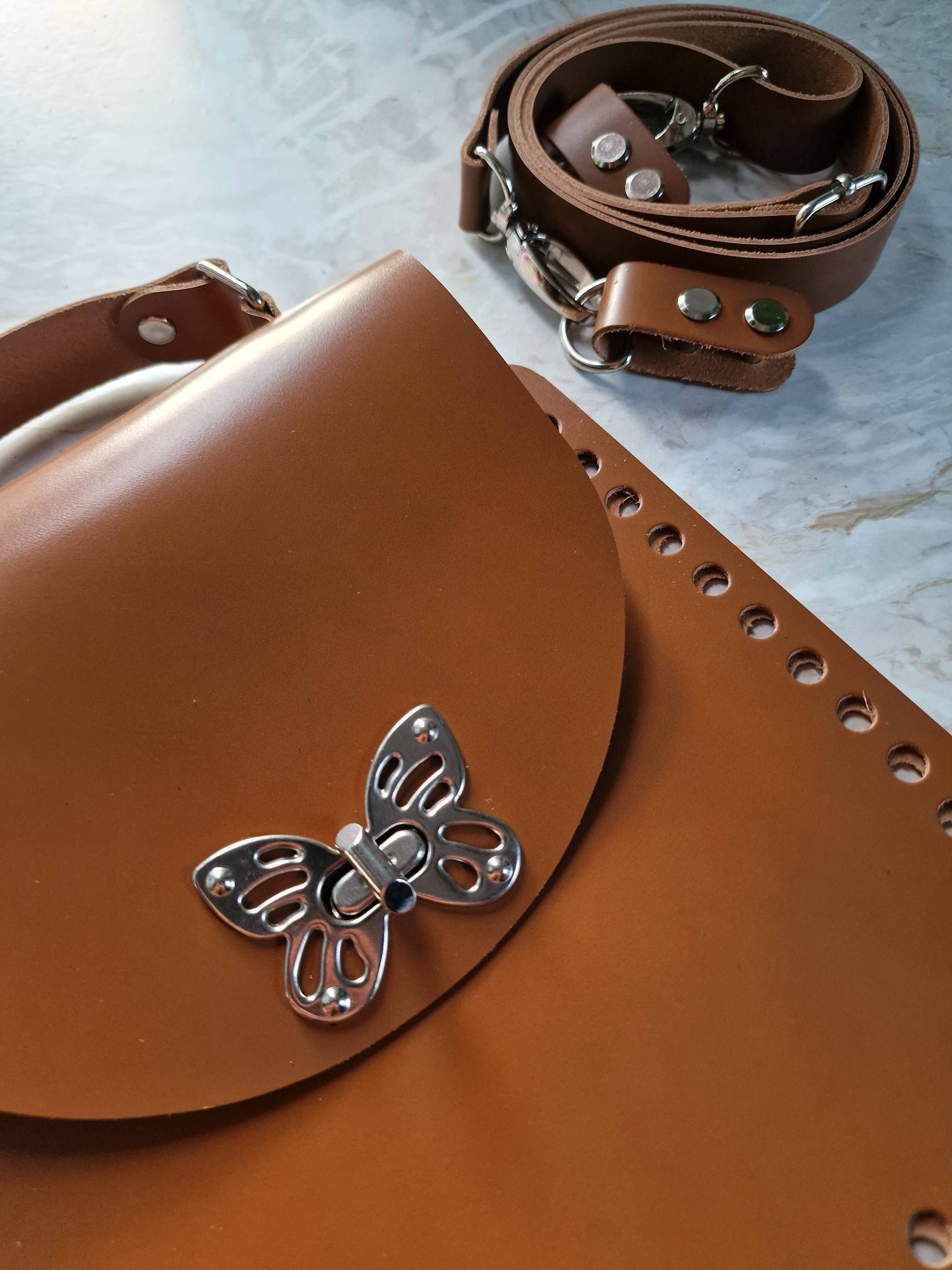 Rankų darbo odinis viršelis su skylutėmis aplink kraštus – idealus pasirinkimas nertoms rankinėms.