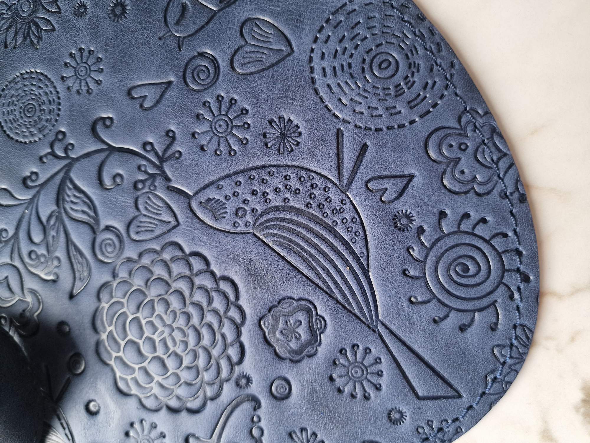 Tamsiai mėlynos spalvos odinis atvartas nertai rankinei įspaudu „Augalai ir paukščiai“ – tai išskirtinė detalė, kuri sujungia tvirtumą, jaukumą ir kūrybos lengvumą.