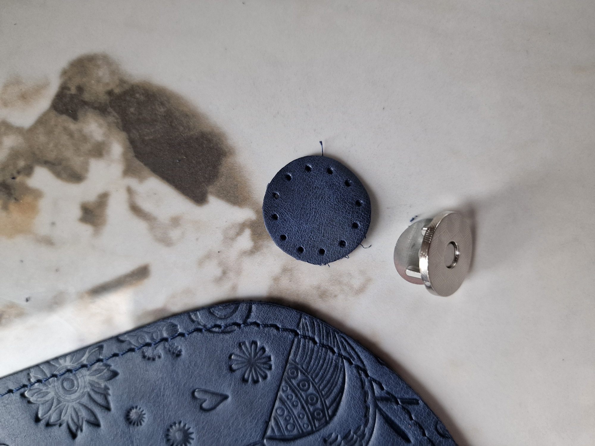 Komplekte – viršelis, magnetinis užsegimas, užsegimo nugarėlė su prisiūtu odiniu apskritimu;