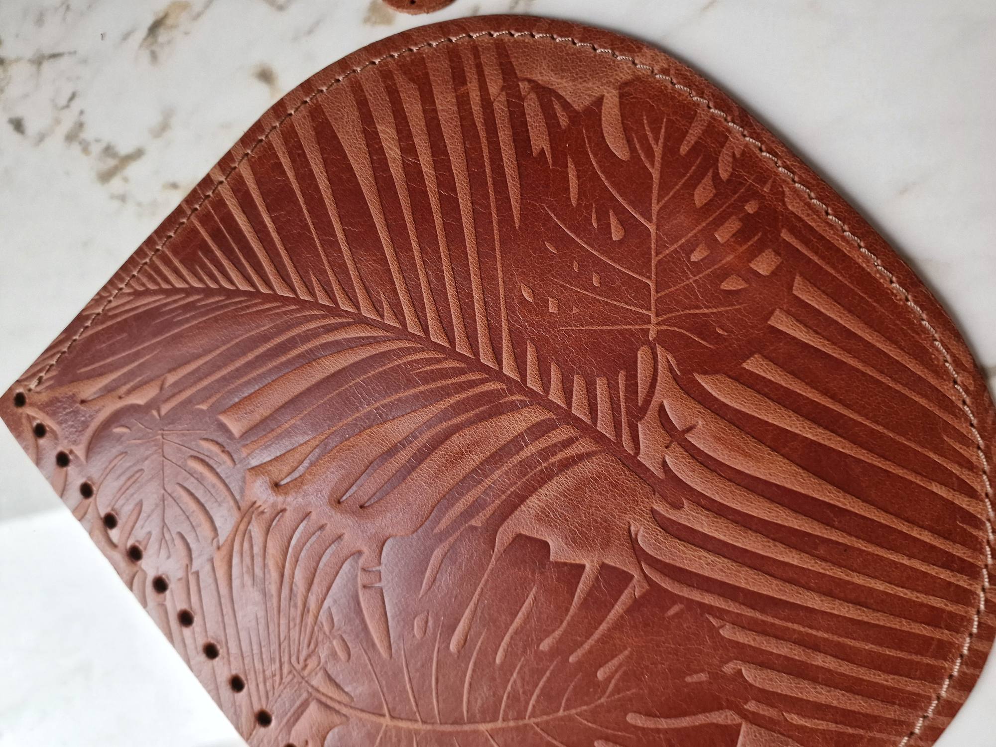 Tamsiai rudos spalvos odinis atvartas nertai rankinei su įspaudu „Augalai“ – tai išskirtinė detalė, kuri sujungia tvirtumą, jaukumą ir kūrybos lengvumą.