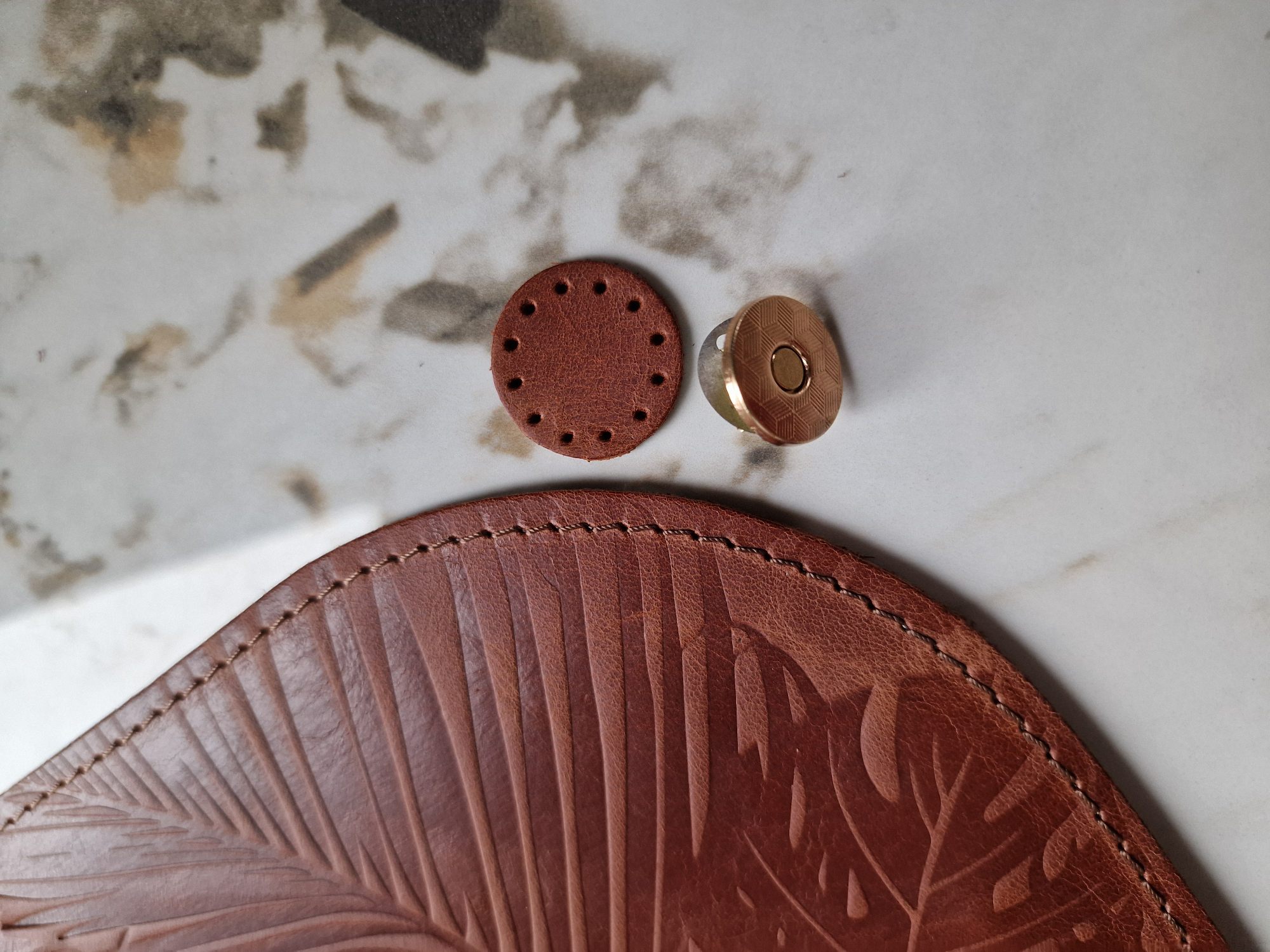 Komplekte – užsegimo nugarėlė su prisiūtu odiniu apskritimu ir viršelis.