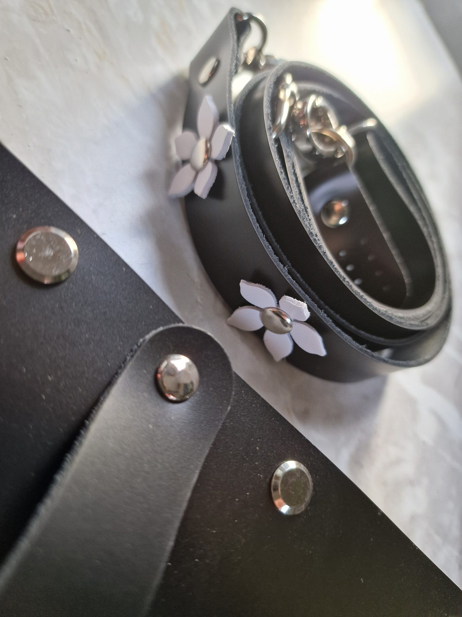 Rankų darbo odinis viršelis su gėlių dekoru ir ilga reguliuojama rankena, pagamintas iš natūralios karvės odos.