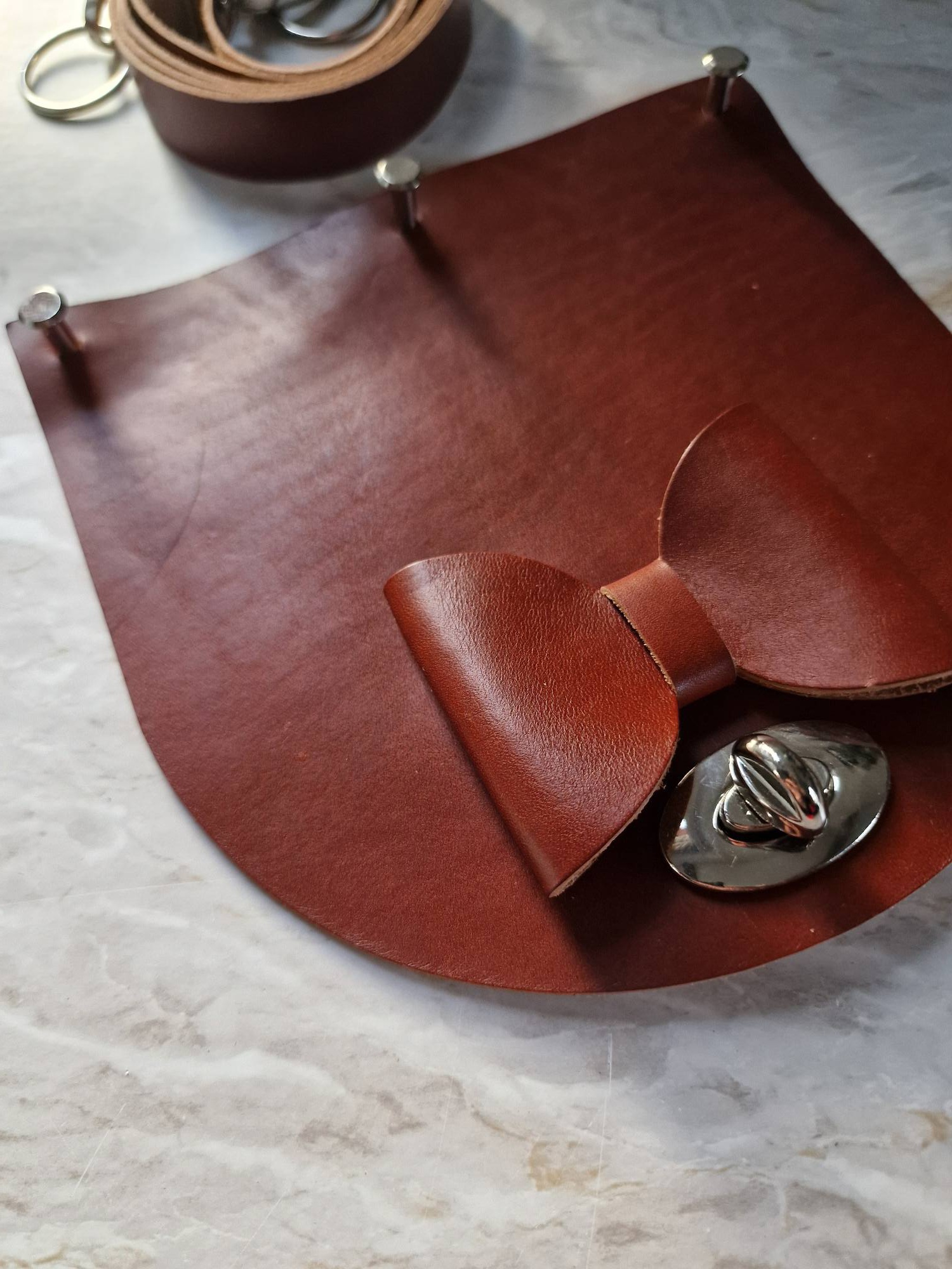 Rankų darbo odinis viršelis su kaspinu ir reguliuojama ilga rankena, pagamintas iš natūralios karvės odos.