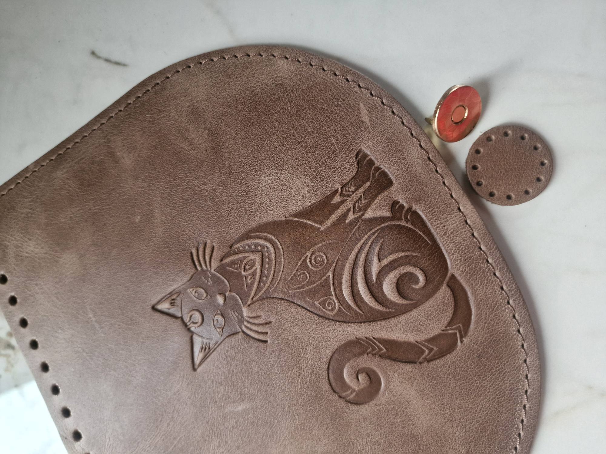 Rudos spalvos odinis atvartas nertai rankinei su įspaudu „Katinas“ – tai išskirtinė detalė, kuri sujungia tvirtumą, jaukumą ir išskirtinumą.
