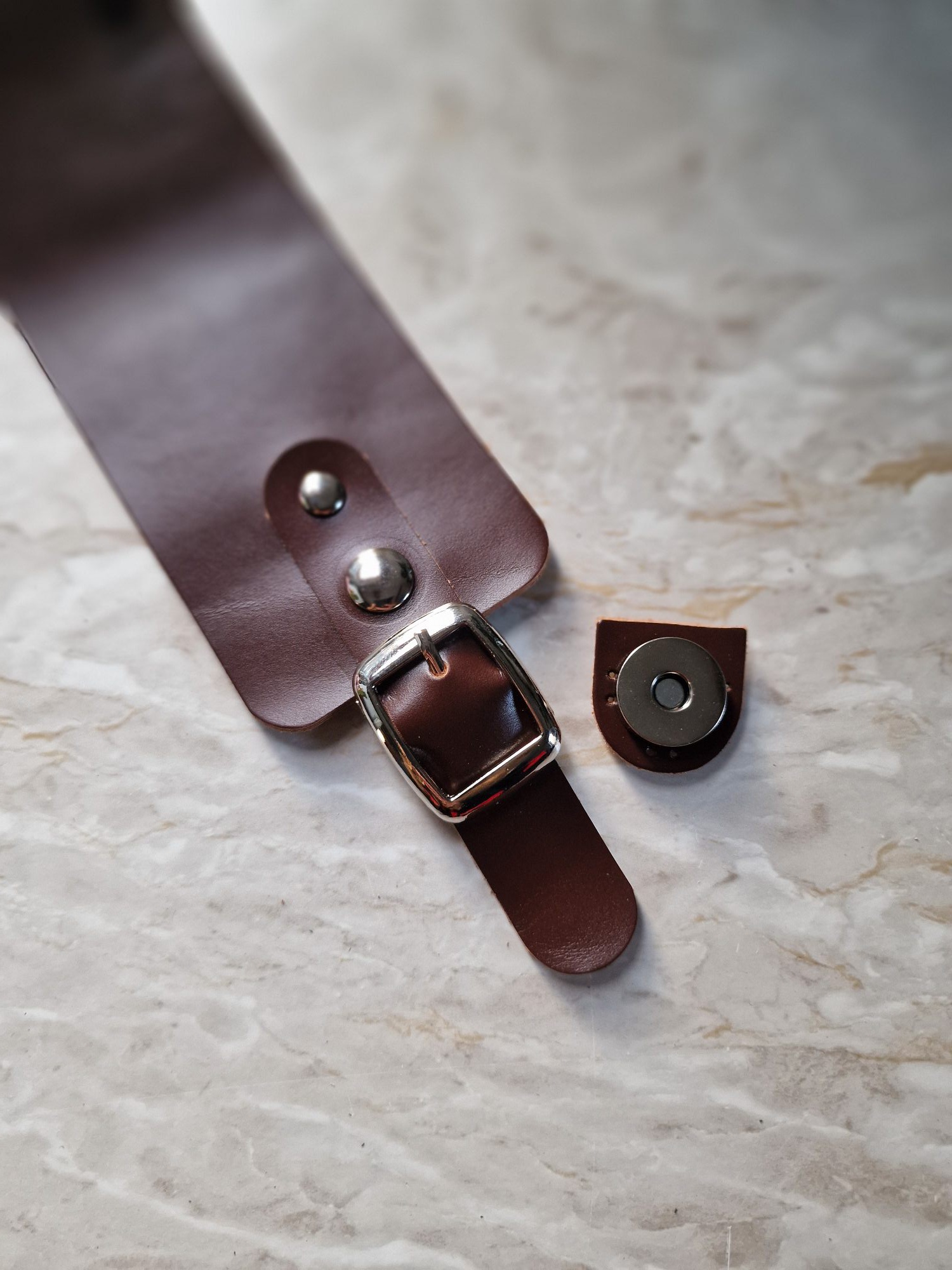 Pagamintas iš natūralios karvės odos, tvirtas ir kruopščiai apdirbtas gaminys, skirtas rankinėms, kuprinėms ar kūrybos projektams.