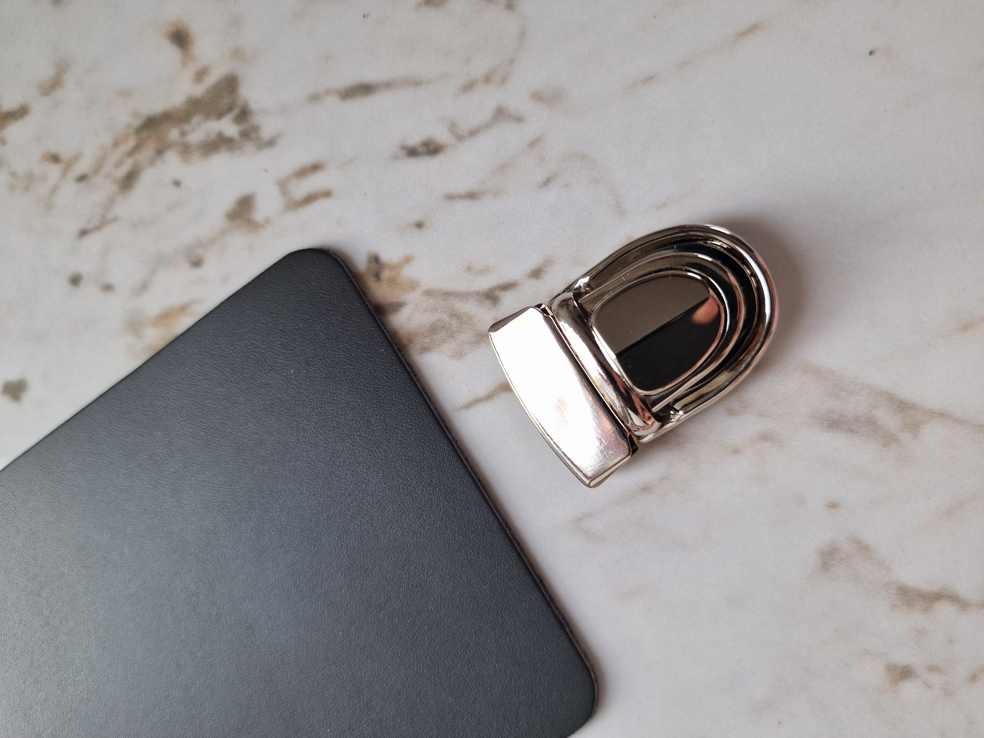 Tamsiai pilkos spalvos odinis viršelis – subtilus, elegantiškas ir išskirtinis. Komplekte yra viršelis ir metalinis užsegimas.