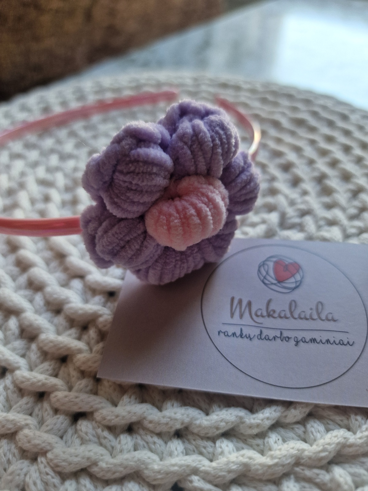 Rankų darbo gėlytė nerta iš minkštos, veliūrinės tekstūros siūlų, kurie sukuria jaukų, žaismingą derinį.