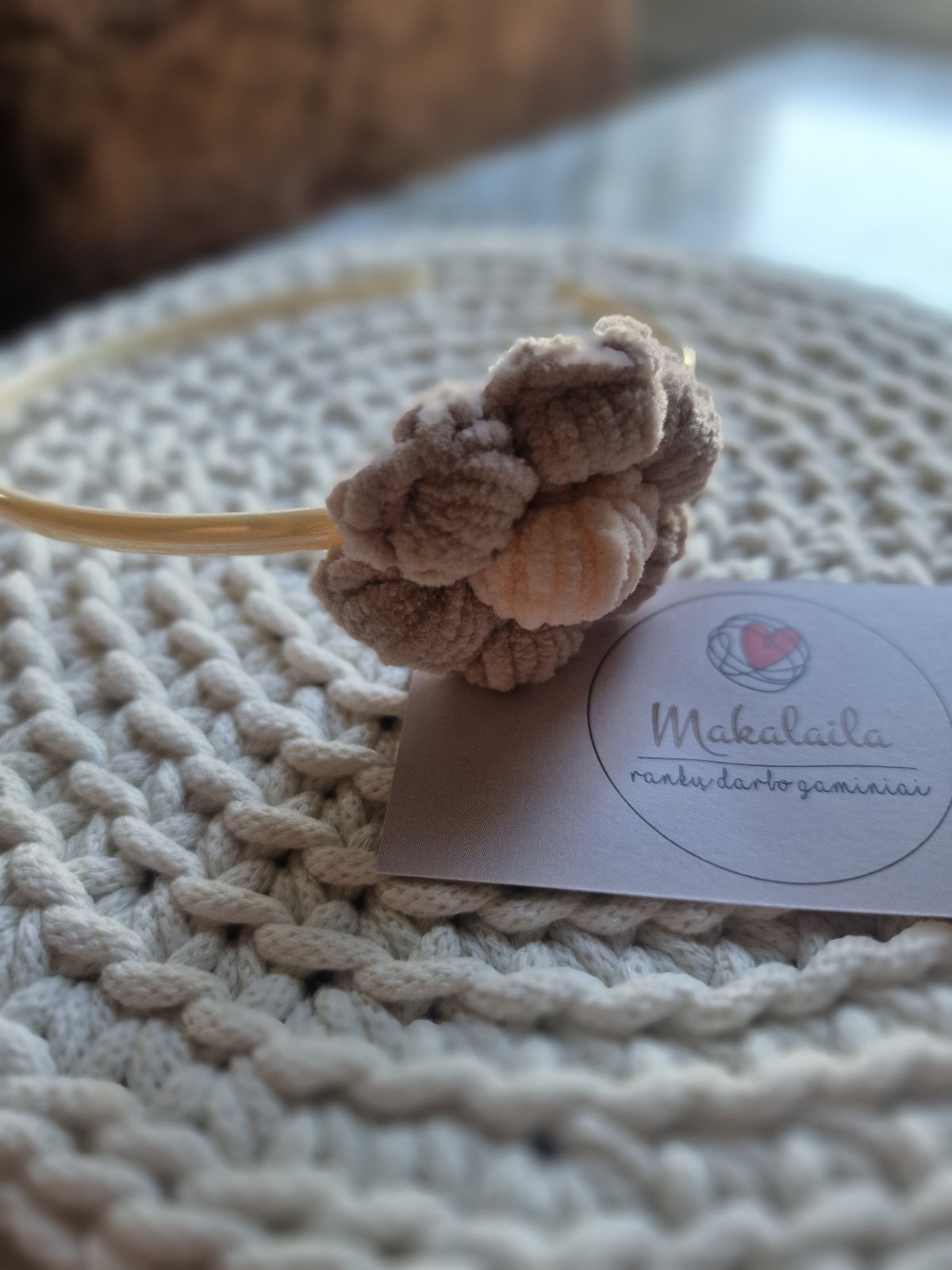 Rankų darbo gėlytė nerta iš minkštos, veliūrinės tekstūros siūlų, kurie sukuria jaukų, žaismingą derinį.