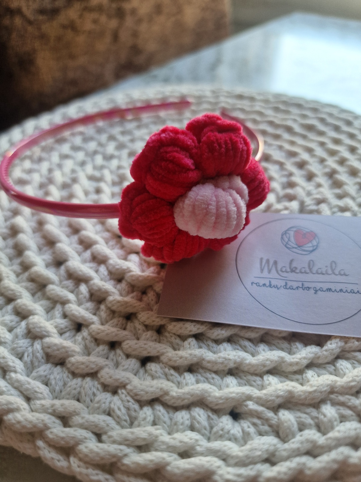Rankų darbo gėlytė nerta iš minkštos, veliūrinės tekstūros siūlų, kurie sukuria jaukų, žaismingą derinį.