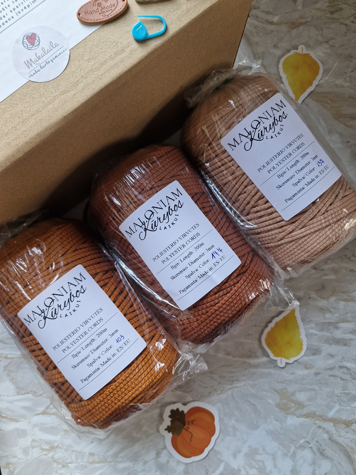 3 kruopščiai parinktas 3mm rudens atspalvių virvutes(po 200metrų ritinėlyje);